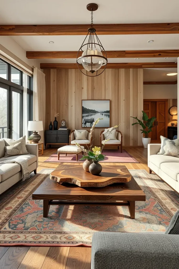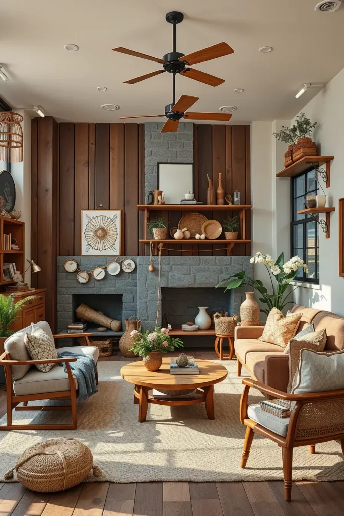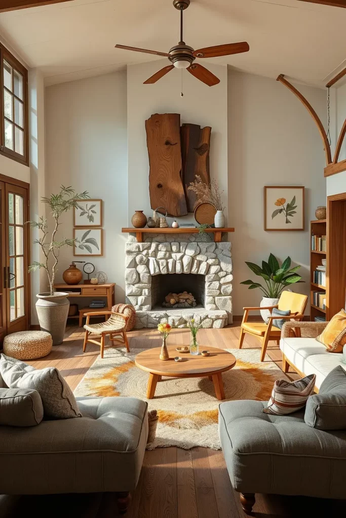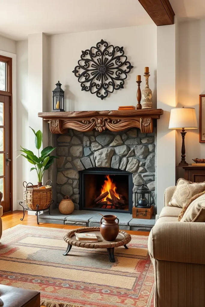 While designing, I’d feature a fireplace with a handwoven rug and artisan mantlepiece decor such as carved figurines. This would make the hearth the centerpiece of the room while drawing the eye of every guest.