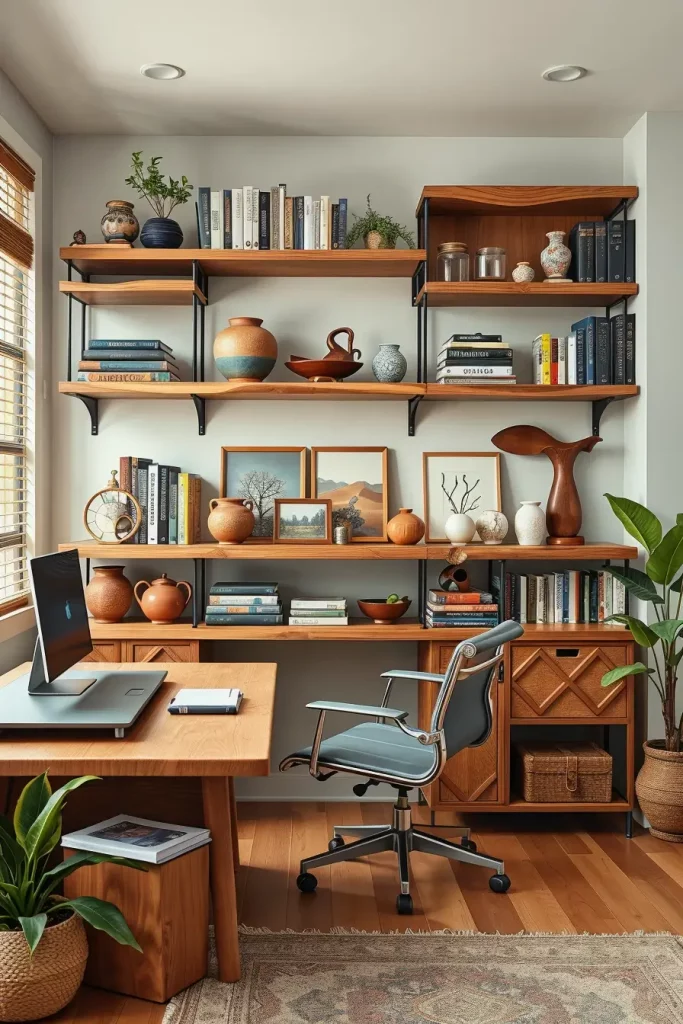 Having an elegantly crafted desk enhances visual balance while strategically placed artisanal pieces can reduce clutter while improving motivation. According to House Beautiful, personal and curated workspaces feel creative and increases focus.