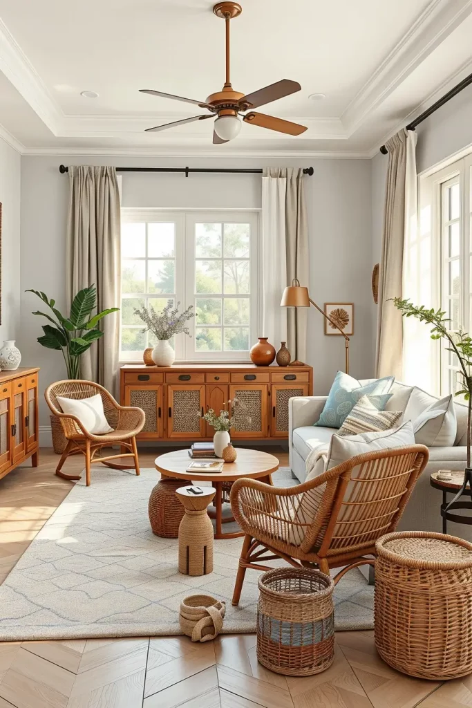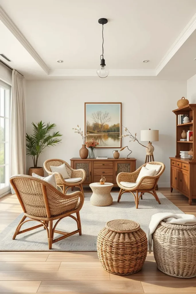 As I see it, items like cane back dining chairs and rattan side tables can be placed in the living room, bedroom, and even the home office. These items are easy to use and strong, and their neutral colors go well with almost any scheme. The space can also be spruced up with woven storage baskets and cane panel wardrobes to add a touch of skilled craftsmanship without the clutter.