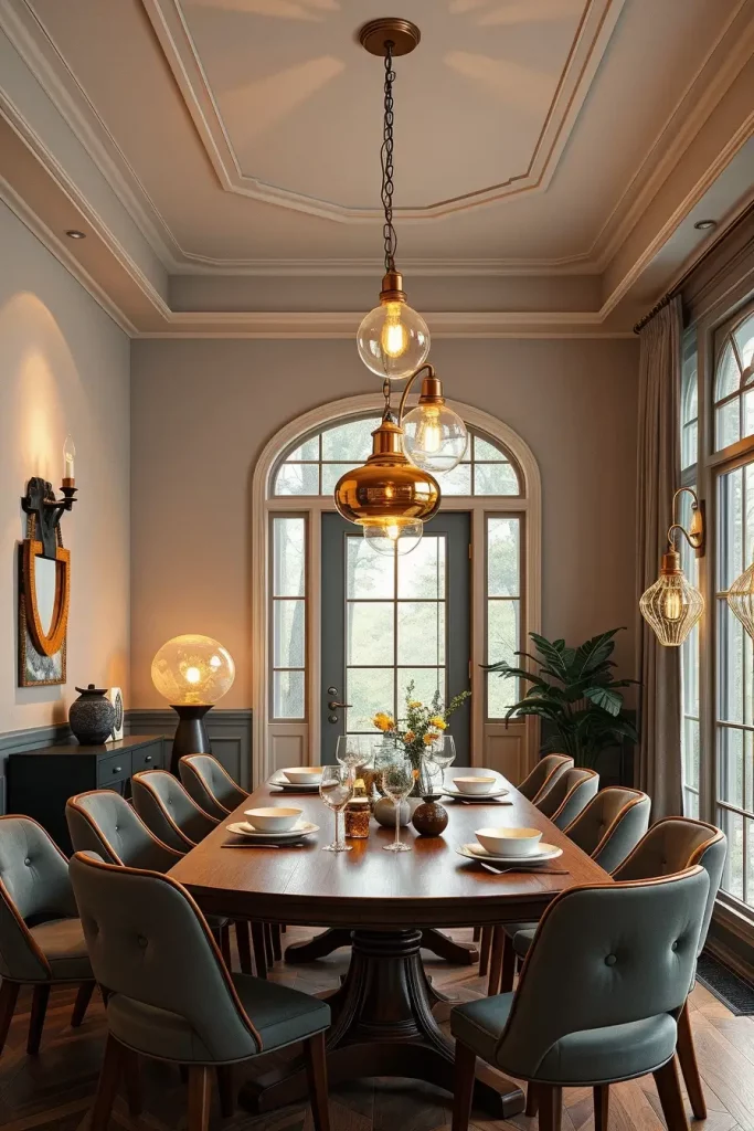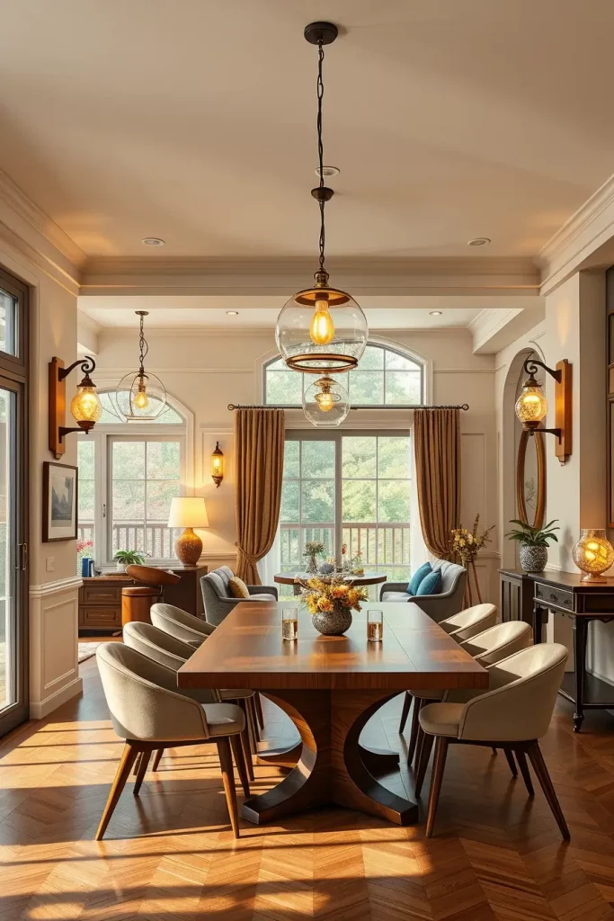 For the dining and living rooms, I always recommend oversized pendant or handblown lamps. These lighting pieces enhance the coziest and inviting atmosphere throughout the entire home. During this, the warm soft glow is gently cast making it feel wonderful. Character sconces that enhance the mood of a space, such as hand carved wooden frame or ceramic base sconces, also add charm.