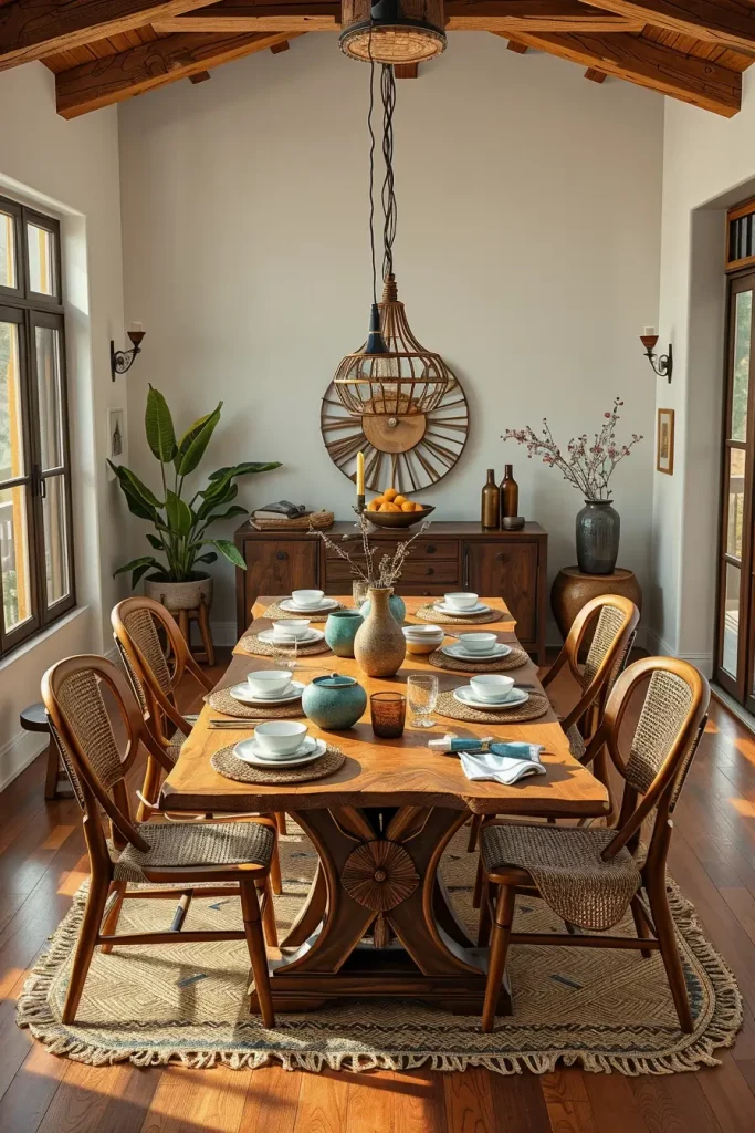 In my vision, besides the table I would place handwoven placemats, bringing together a bold design. This would emphasize the handcrafted feel of the dining area and maintain design coherence throughout.