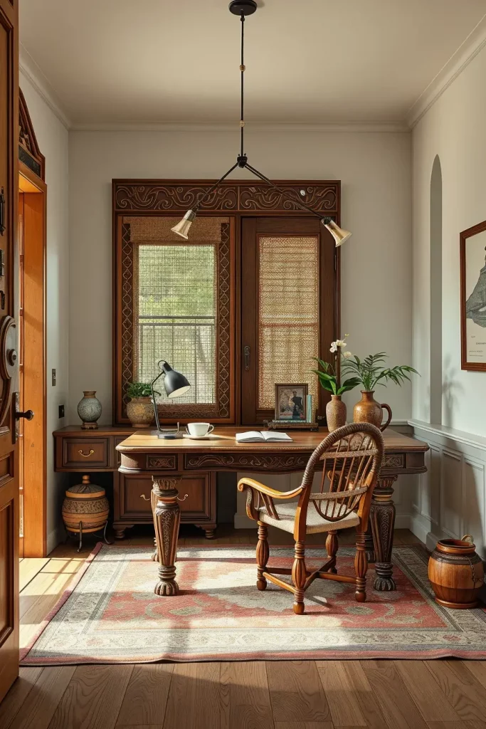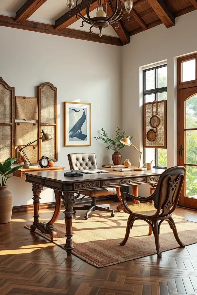 Our recommendation for the desk includes elegantly hand-carved legs, integrated drawers, or even built-in woven cane panels. These elements turn a basic desk into a stunning piece which will help in making the home office look refreshing and cozy. Adding an artisan desk chair will further highlight the desk’s beauty while offering additional comfort and visual balance.