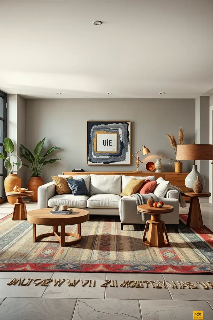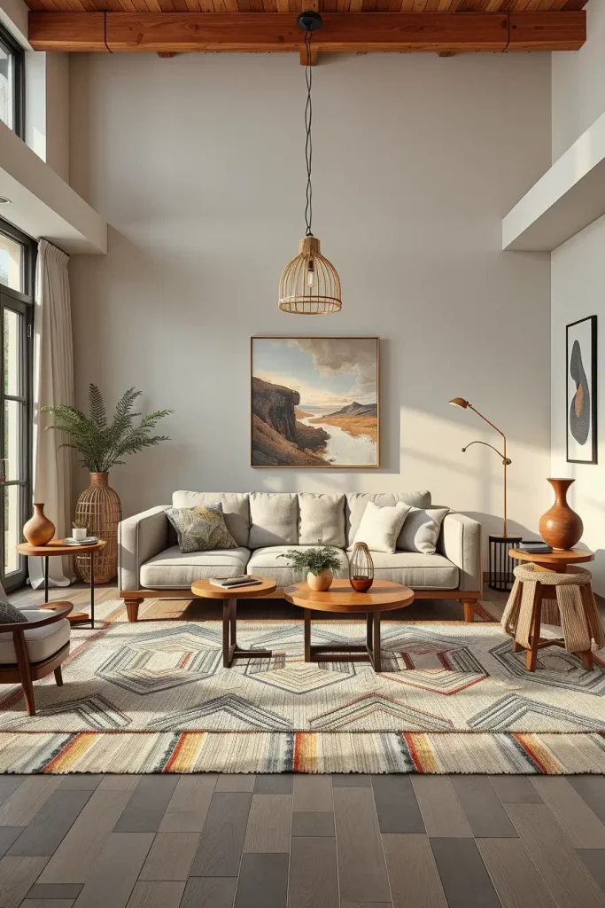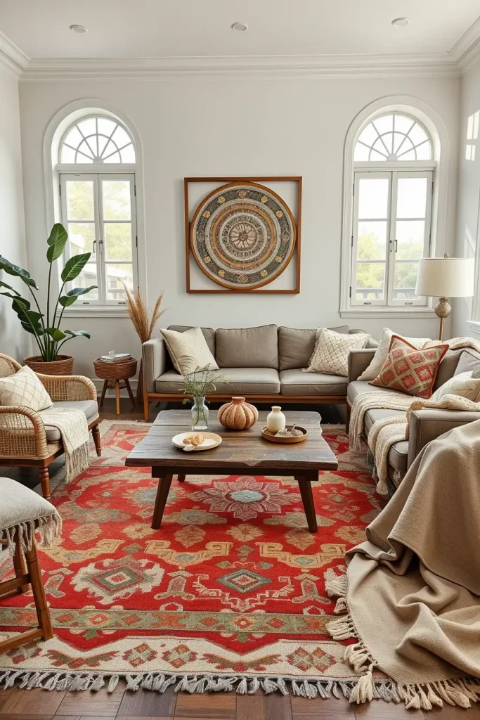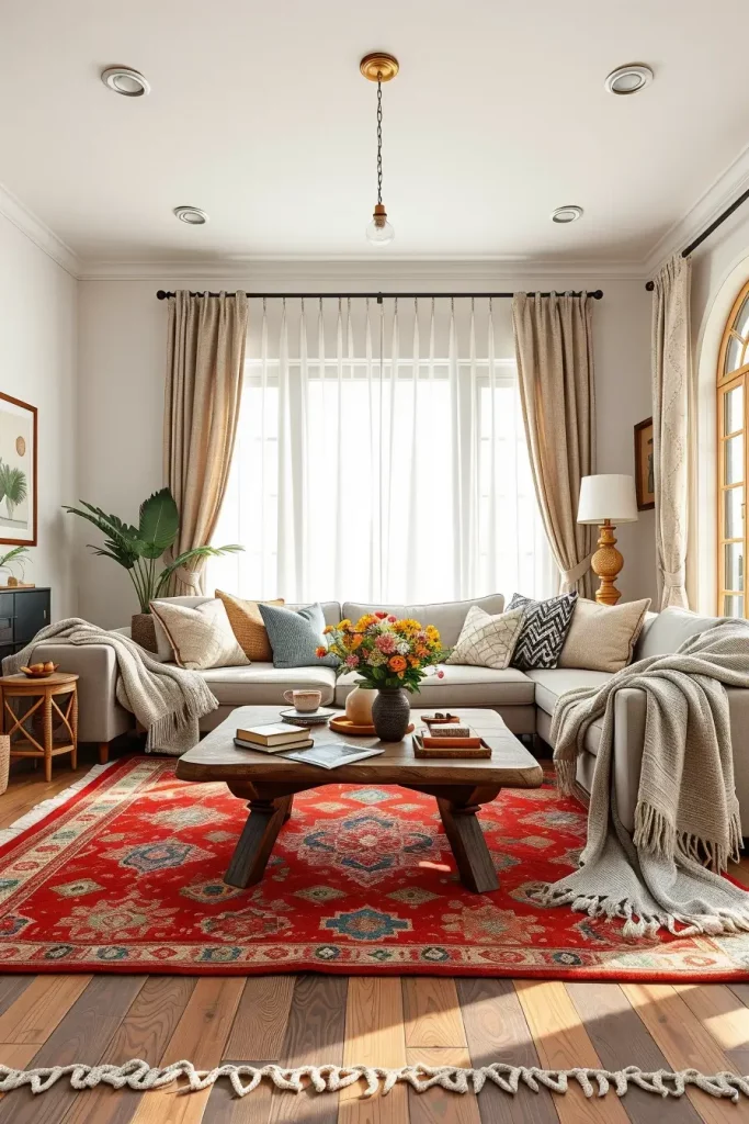 Complementary cushions or throws can be paired with the artisan rug to make the room feel more cohesive. In my opinion, this layered texture design is best.