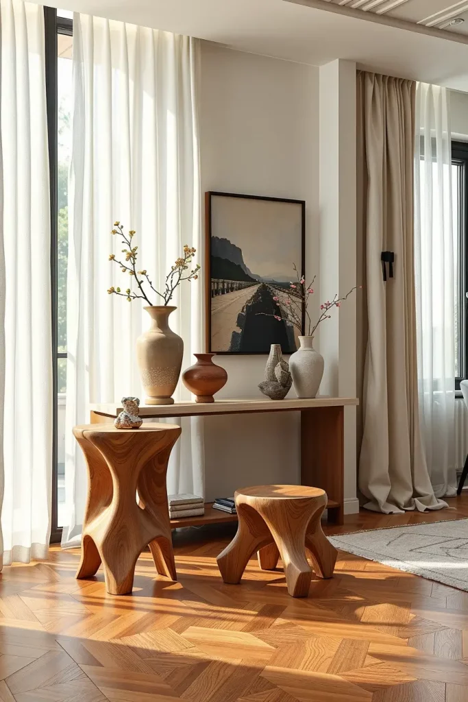To achieve balance, I recommend pairing sculptural artisan pieces with draped linens or wood-paneled walls. This provides a striking contrast with the sculptural pieces while keeping the design harmonious.