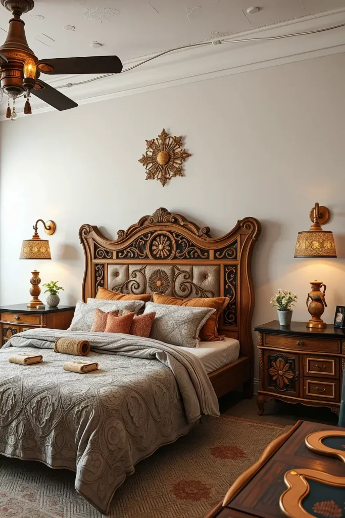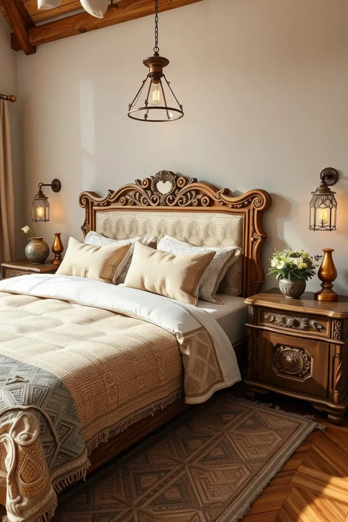 Equally important for the overall look of the room, I would combine the headboard with artisan nightstands and hand-crafted light fixtures. Introducing these pieces would also strengthen the bedroom’s artisanal charm, ensuring a seamless look.