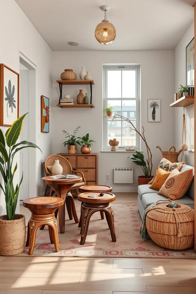 In these living spaces, balancing practicality and artistry comes in the form of slender artisan desks, folding chairs, and stackable stools. Space becomes a canvas, and these transforming handwoven storage baskets and miniature shelves overflow with character while resolving clutter gracefully.