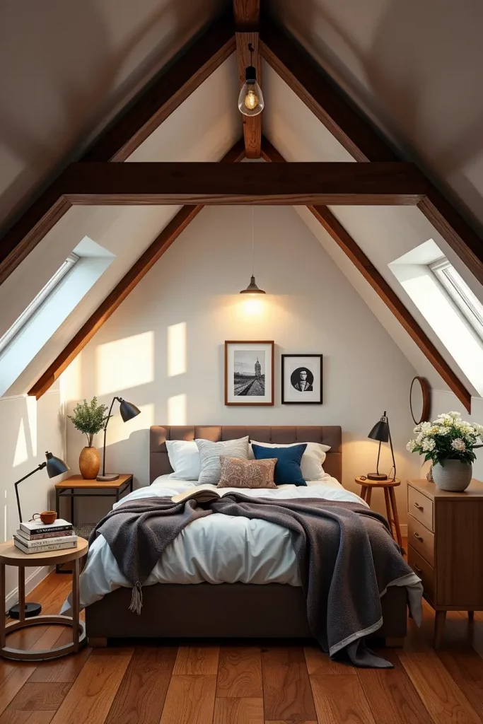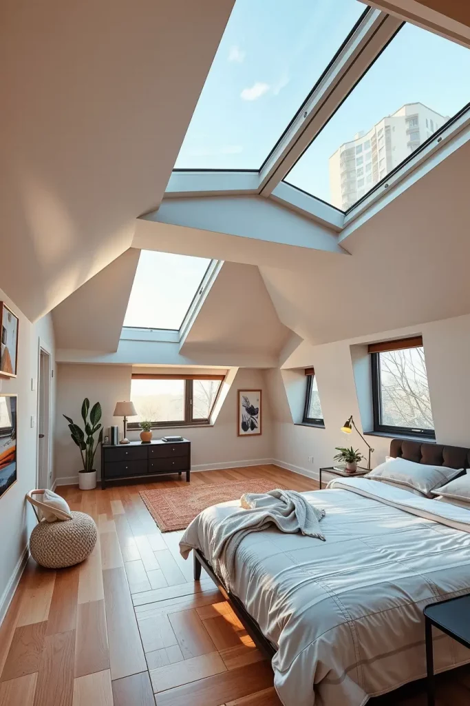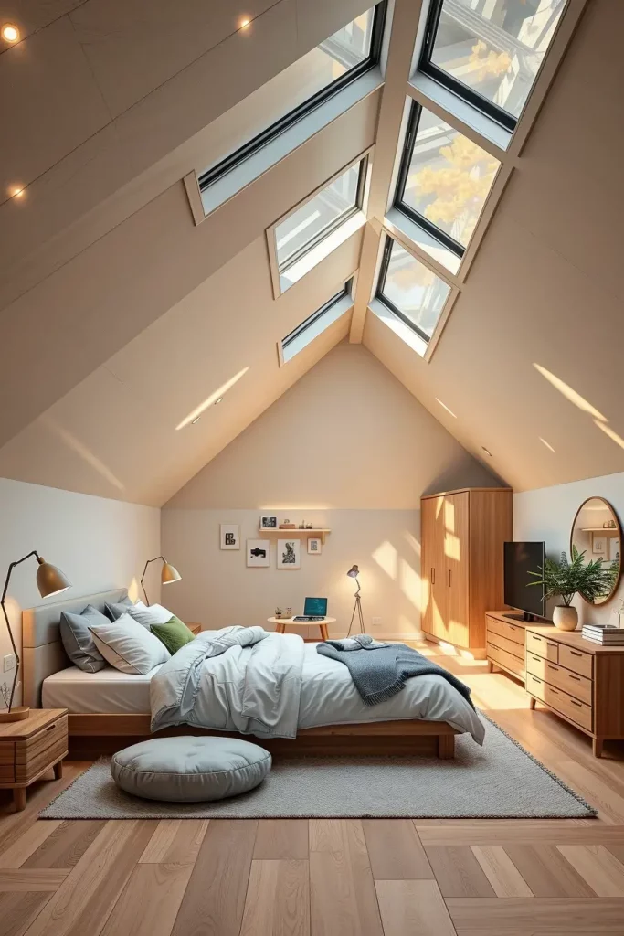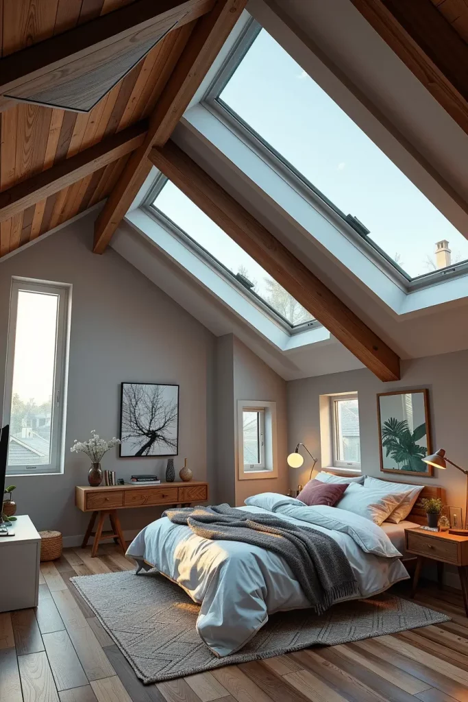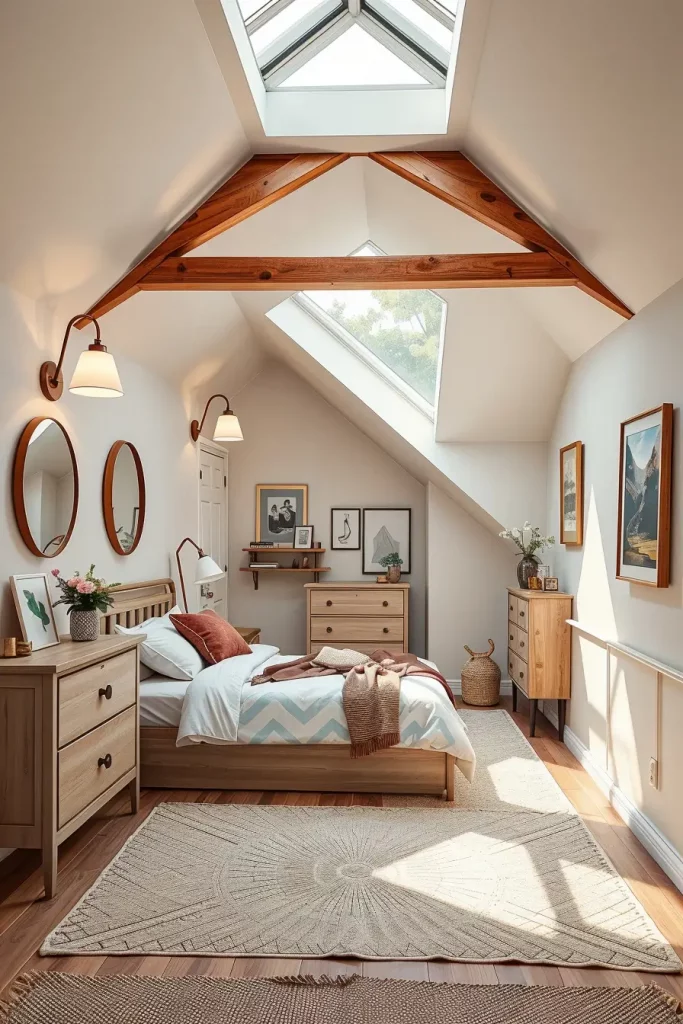 In case of furnishings, I would choose a multifunctional furniture, including storage beds, small dressers, and lamps mounted on walls to minimize clutter. Natural light can be increased using the mirrors which are placed strategically opposite to the skylights, and the balance of the framed artwork which is placed low on the walls helps to create harmony without competing with the angular ceiling. The decor is also completed with the use of soft throw blankets, narrow shelving, and small potted greenery (only in the areas where they do not obstruct foot traffic).