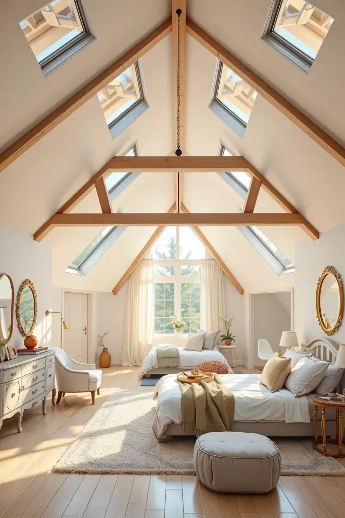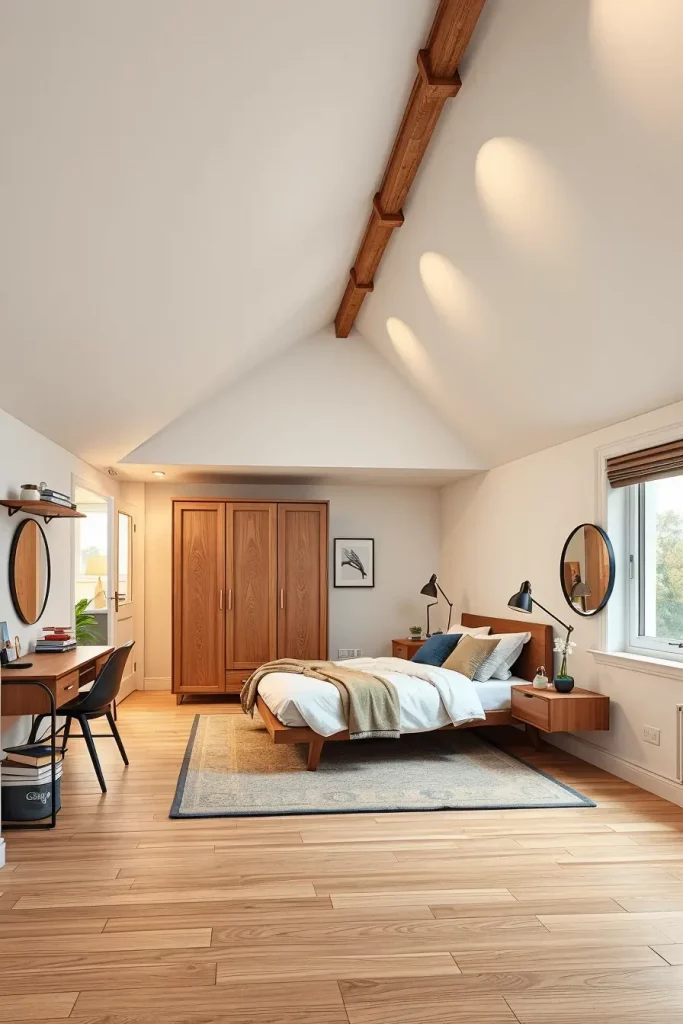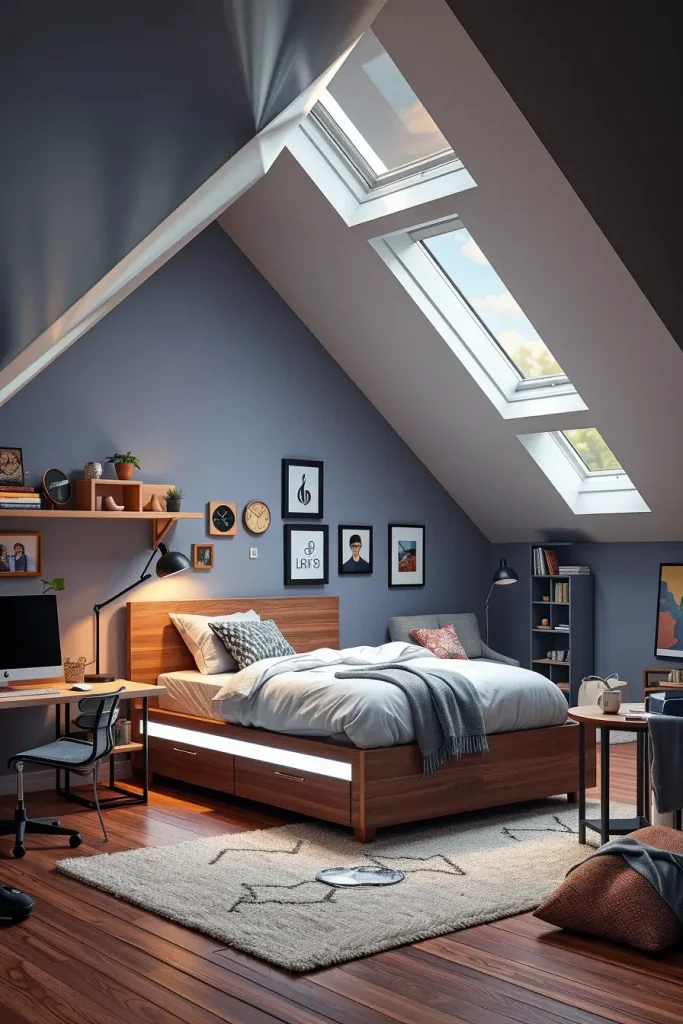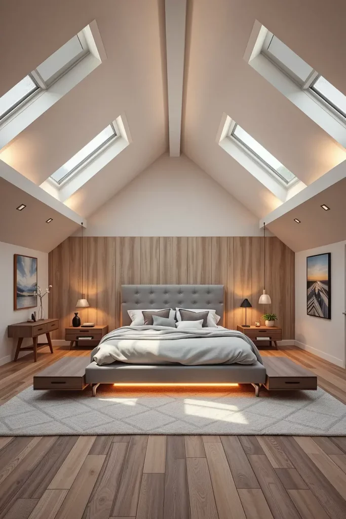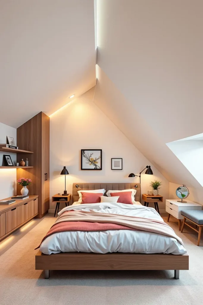 In case of furnishings, I would choose a multifunctional furniture, including storage beds, small dressers, and lamps mounted on walls to minimize clutter. Natural light can be increased using the mirrors which are placed strategically opposite to the skylights, and the balance of the framed artwork which is placed low on the walls helps to create harmony without competing with the angular ceiling. The decor is also completed with the use of soft throw blankets, narrow shelving, and small potted greenery (only in the areas where they do not obstruct foot traffic).