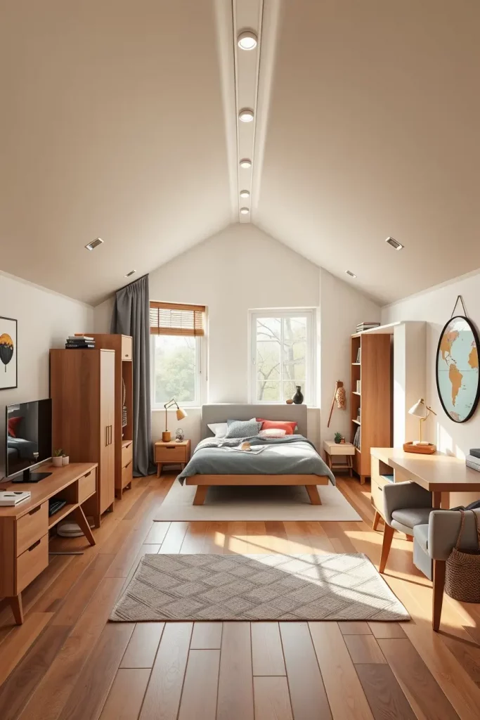 I provide furniture that is sleek and functional like low profile beds, modular night stands and fitted built-in shelving that goes around sloping walls. The expansion of space is made visually with the use of soft textures, light-reflecting materials, and subtle patterns. I am inclined towards neutral colors and warm colors to ensure the room is contemporary and classic. The furniture and furnishings are placed in the right location to make sure that each corner is functional.