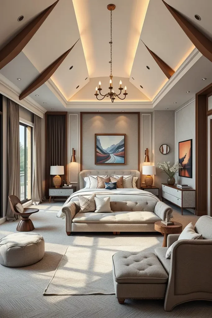 I tend to match an impressive ceiling with minimal furniture that is low profile and does not vie against the ceiling. The ceiling is made of a low bed frame, neutral bedding, and minimalist side tables, that enable the ceiling to become the central focus. I also use the use of subtle lighting that includes LED lighting along beams or angled spotlights to put emphasis on the architectural detailing.