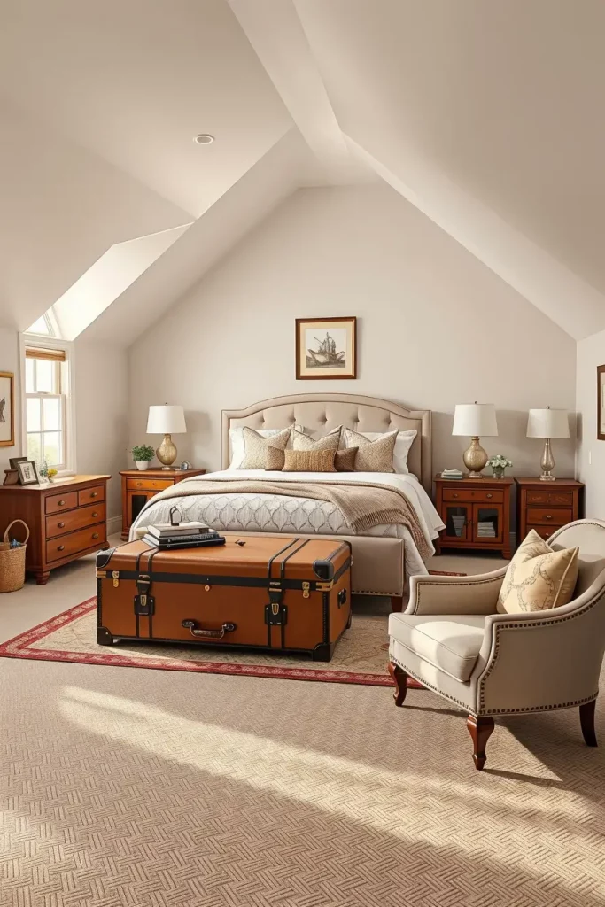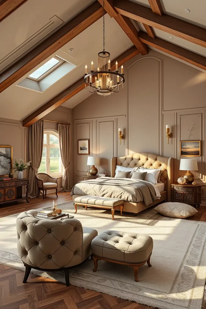 In the furnishings, I will select high-quality furnishings such as leather headboards, smooth wood finishes, synthetic fabrics, and contemporary lighting lamps. An item like a designer armchair, feature wall or even a custom built storage adds the upscale effect to the room. The luxury impression is completed with built-in lighting, loose fabrics, and various textures without overwhelming the attic.