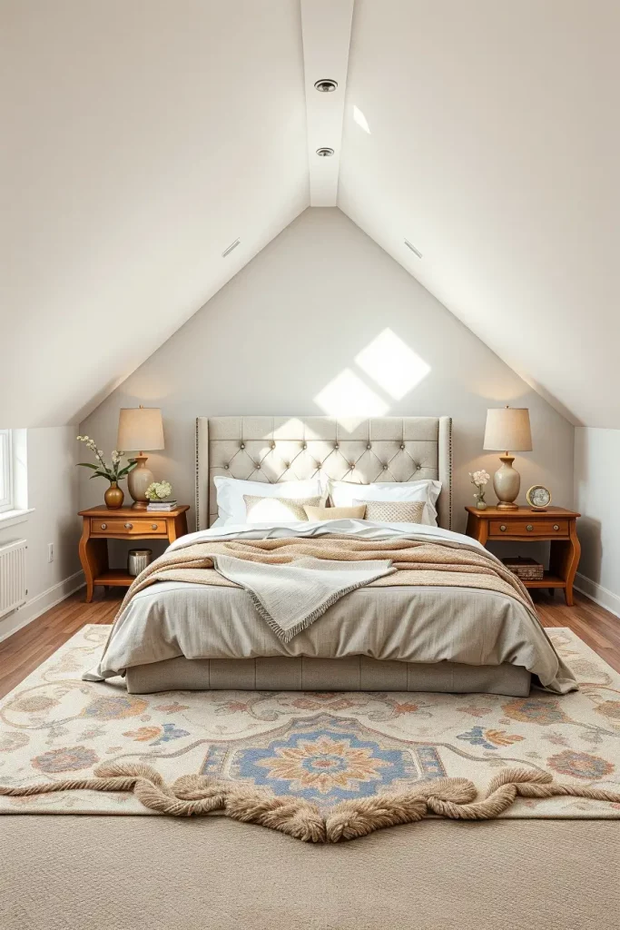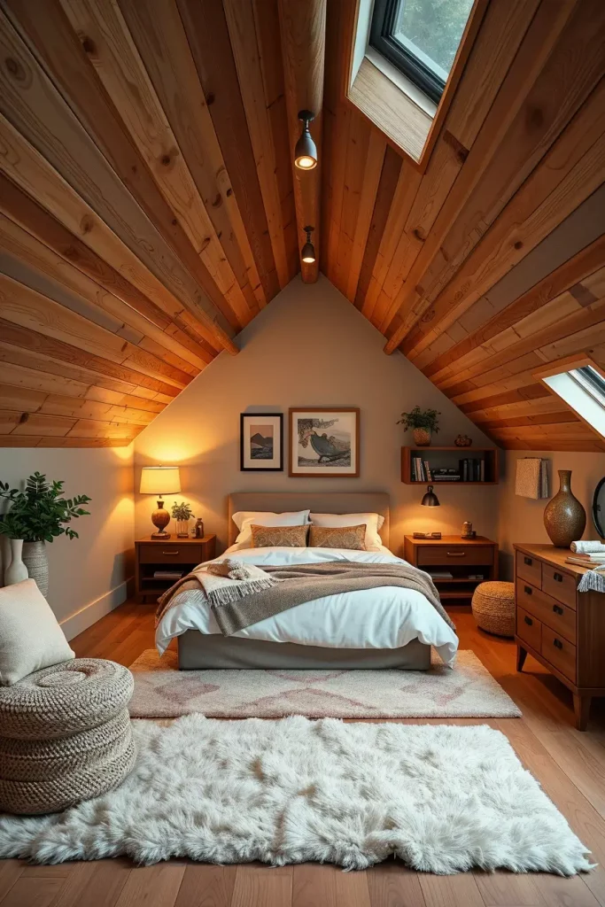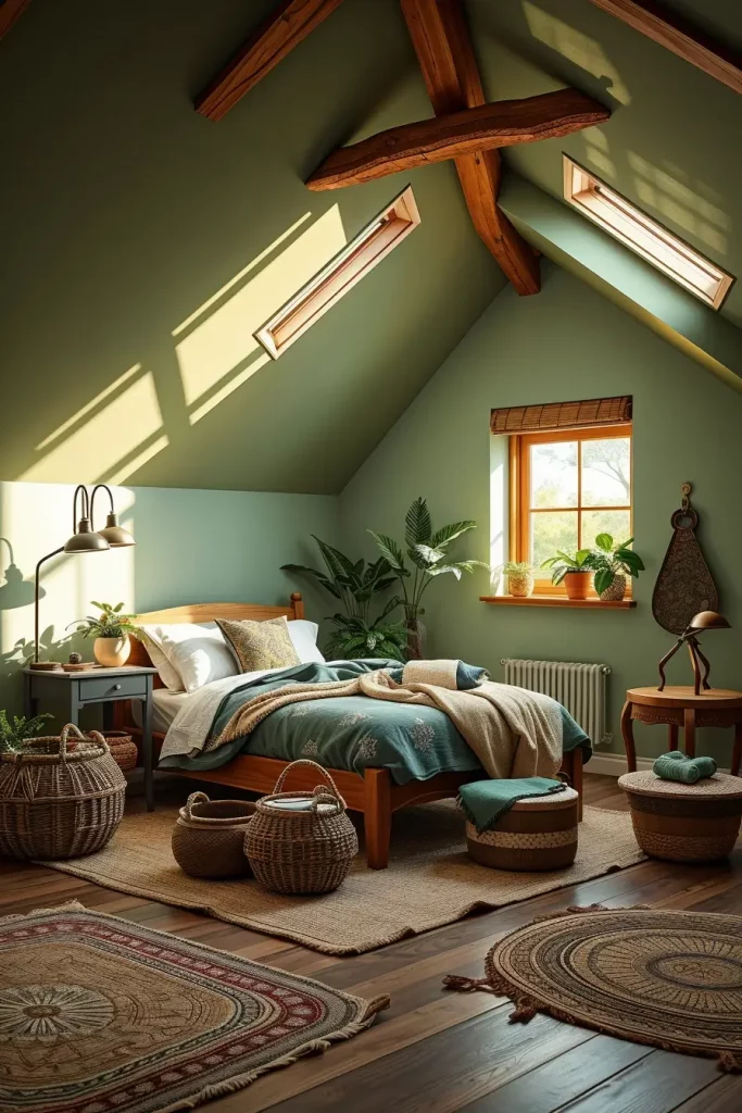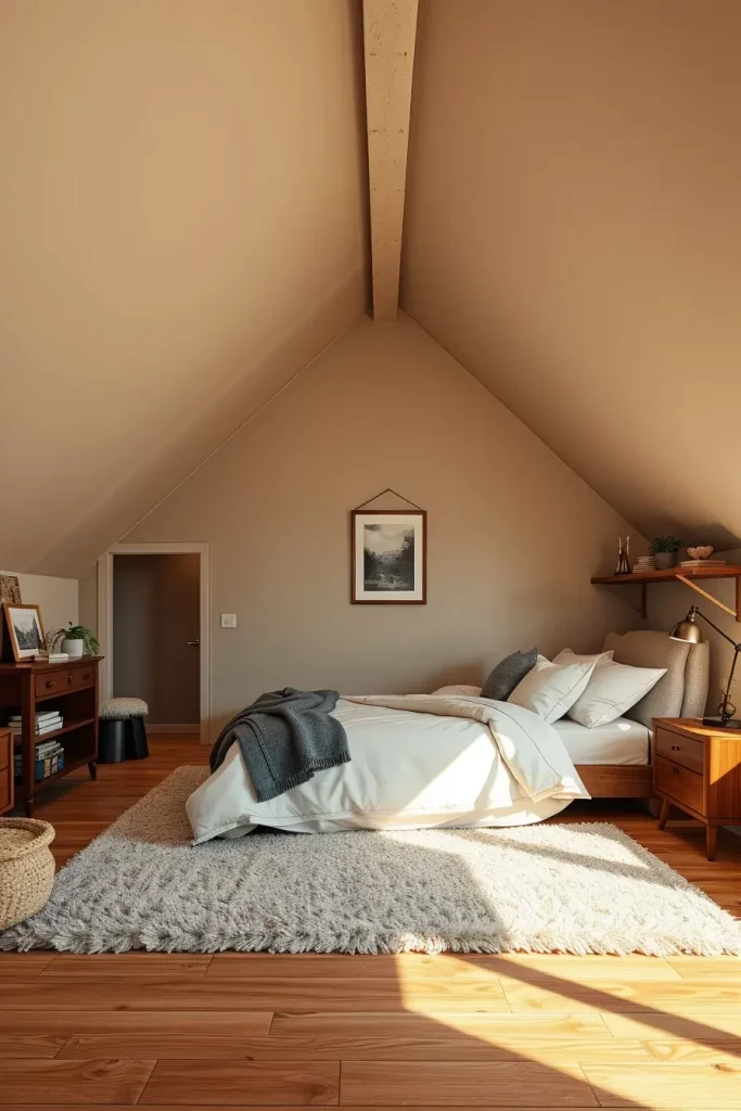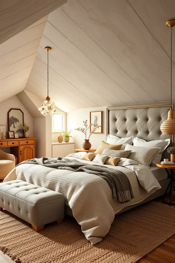 In the case of furniture, I will add wooden bed frames, woven baskets, rattan accents and cloth-based linens of cotton or linen. Skylights are connected with daylight by means of plants or botanical decor. I also prefer to use earthly carpets, stone-like lamps, wooden nightstands, and all the items are arranged to recreat the atmosphere of tranquility and closeness to nature, which is suitable to an attic with its close architecture.