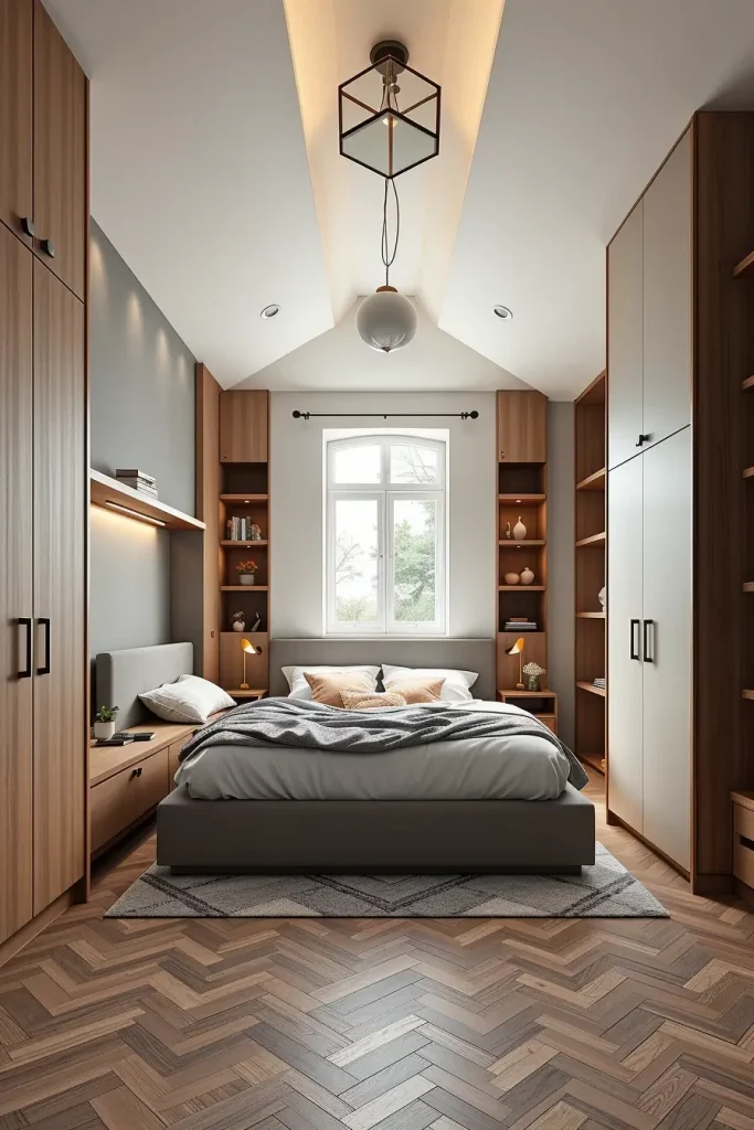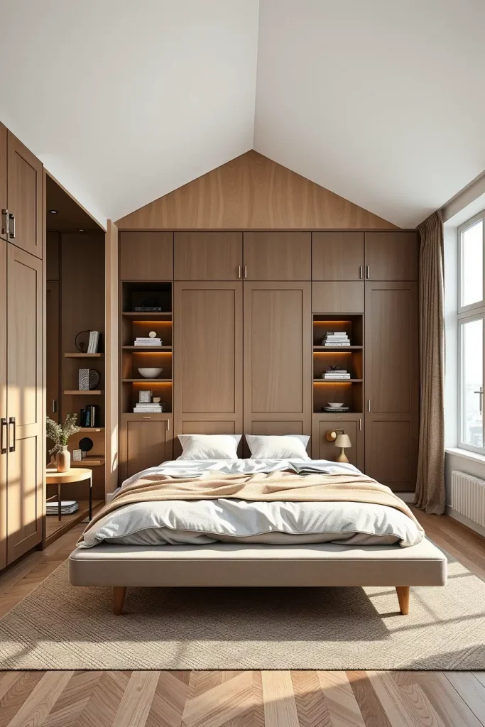 The choice of particular storage components that are selected depends on a set of a combination of drawers, open shelves, and low cabinets fitting under the slope. So much required custom millwork since every inch could be used effectively. I also tend to use soft-close hardware, warm wood finishes and very simple handles to make the design modern but not so striking. These details aid in the development of functionality without interfering with the beauty of the bedroom.