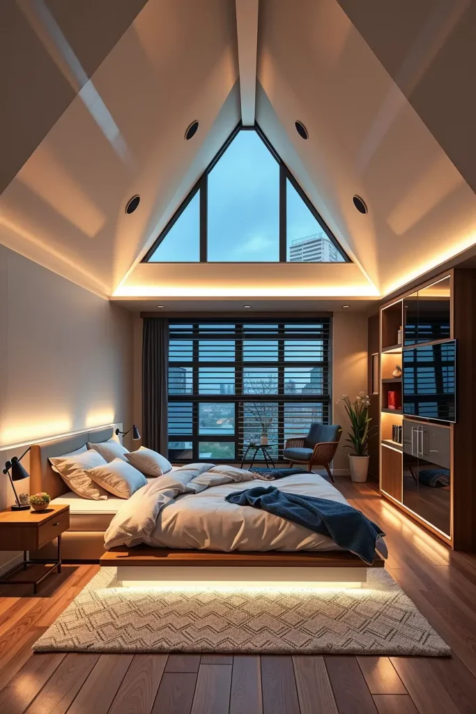 In choosing furnishings to this style, I would focus on low platform bed, floating nightstands, narrow metal or wooden frame wardrobes, and built-in under-eave drawers which can be tapped off without increasing bulk. I also adore the use of skylights since they extend the ceiling visually and add a dramatic effect of daylight. The neutral palette and a combination of textiles as well as natural materials make the area look natural and grounded. In numerous 2026 developments, I have observed that the LED perimeter lighting has been integrated into the sloped roof to provide architectural beauty as well as increase light brightness.