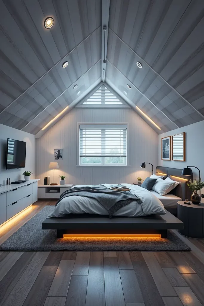 A tech attic may have a smooth platform bed, inbuilt wall storage and a contemporary lighting system. I also use such features as automated blinds, a smart thermostat, and voice-controlled lights. The use of LED strip lights along the ceiling angles, nightstands with wireless charges, and subtle speakers allow having a minimalistic appearance with as much convenience as possible.