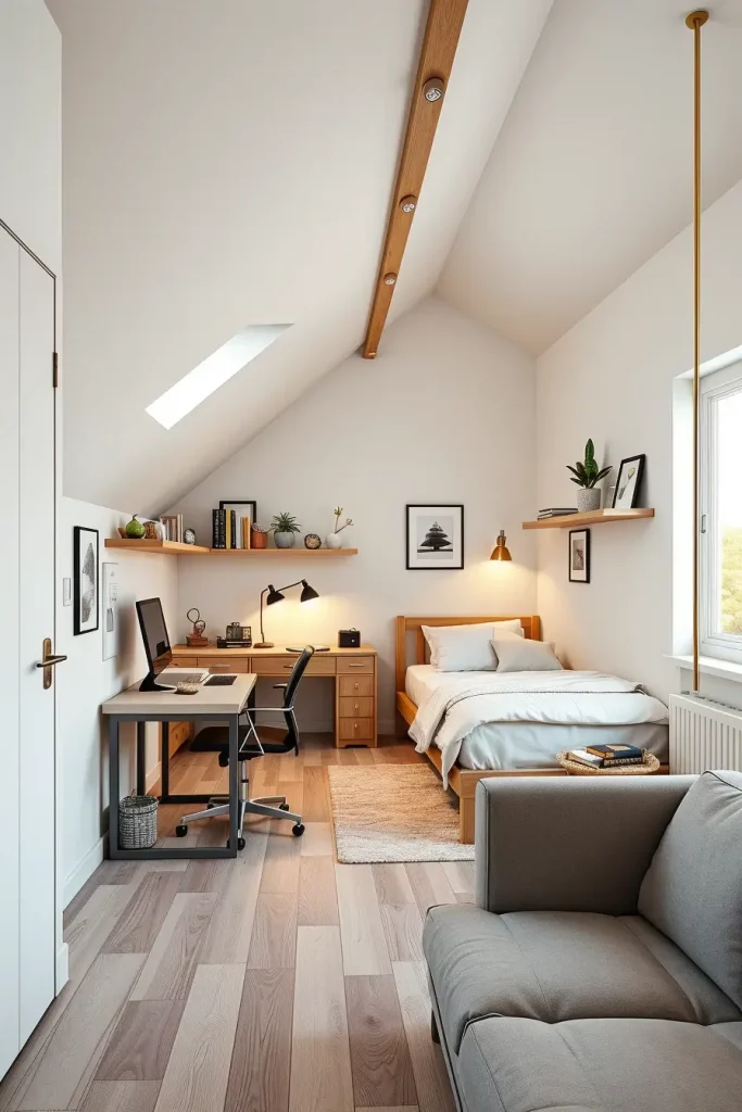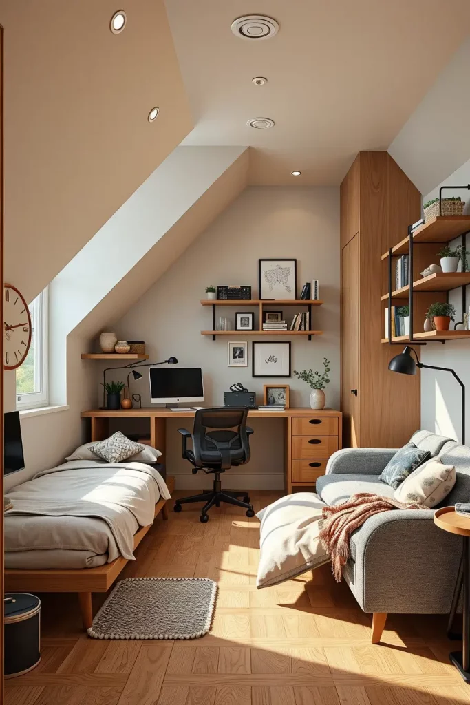 The choice of furniture is very important in this case. A small desk, an ergonomic chair, a low-profile bed, storage units that fit closely against angled walls are usually part of my combination. The shelves on the walls and fold-out workstations can also be used to maximize the available space. Break can be realized with the help of a small sofa or a lounge chair, which will create a distinction between work and rest.