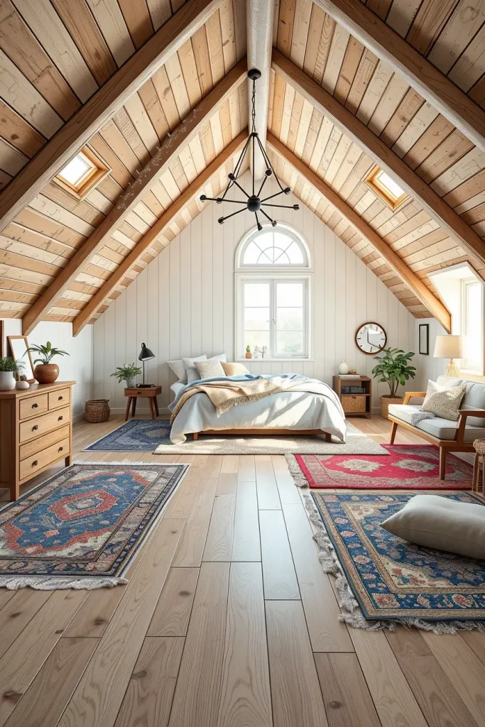 The most common options that I would prefer to use are plush carpet, engineered wood with acoustic underlayment and a luxury vinyl plank which is fitted to reduce noise. Rugs are necessary to provide evidence of warmth and a decrease in the sound of footsteps. The light-colored flooring may be used visually to enlarge the room, and the ceiling of the attic may be perceived as being more open and bright though it has low ceilings.