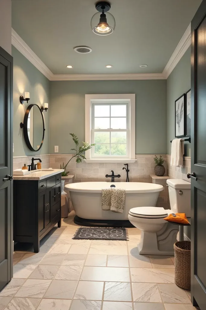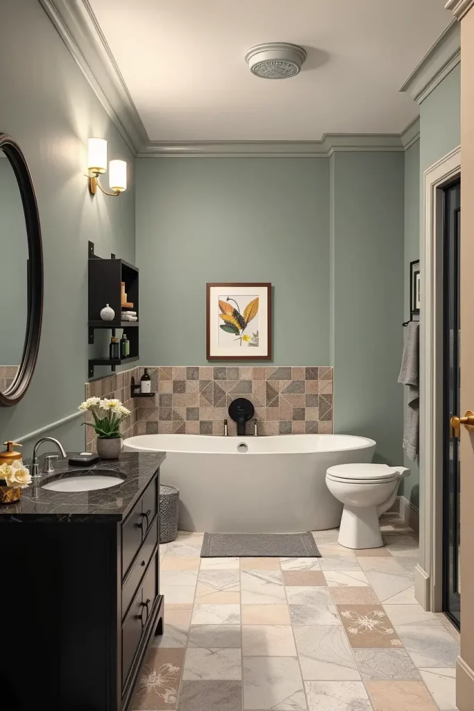 When choosing something in paint color, I match it with the tiles, vanities, and flooring to produce an overall appearance. As a case in point, a light wall painted in pale sage green combined with light stone tiles and a matte black hardware makes a balanced and contemporary style. I also prefer semi-matte finishes as they are moisture resistant and are not too shiny since this will expose the flaws in the walls.