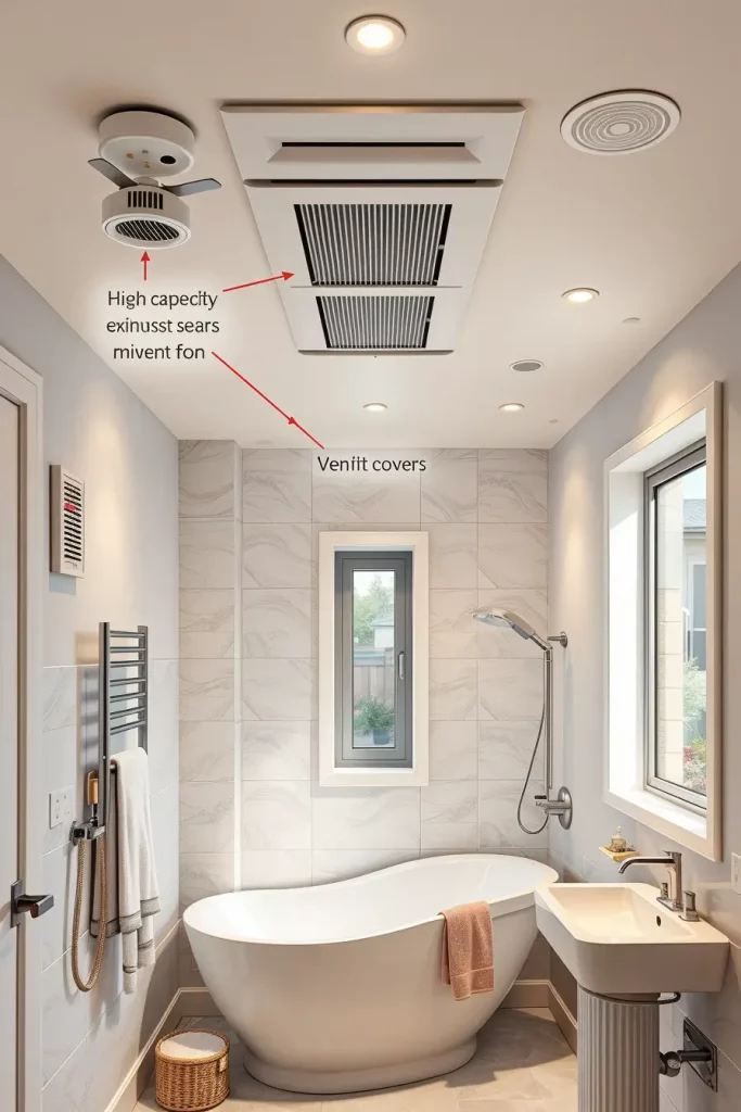 I tend to install larger exhaust fans, ducted systems, and air circulation vents which mix with the finish of the ceiling. I also use glass block windows or narrow hopper windows to bring in the natural airflow, in case space permits. In selecting fixtures, I have in mind models of quiet-operation fixtures that do not interrupt the relaxing ambience of the bathroom. Low profile and smooth vent covers and grilles provide a upscale appearance and yet remain highly functional.