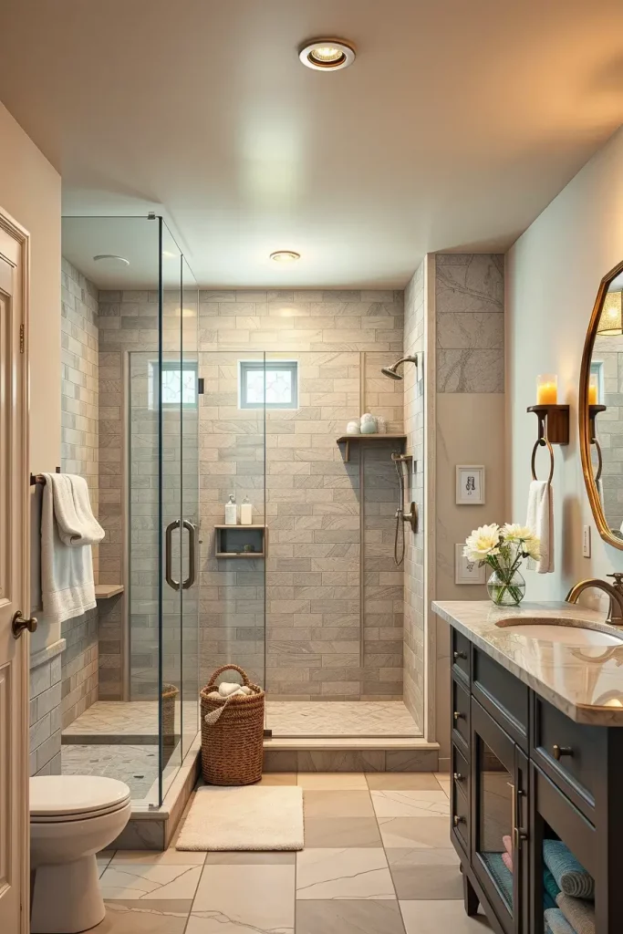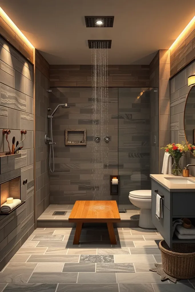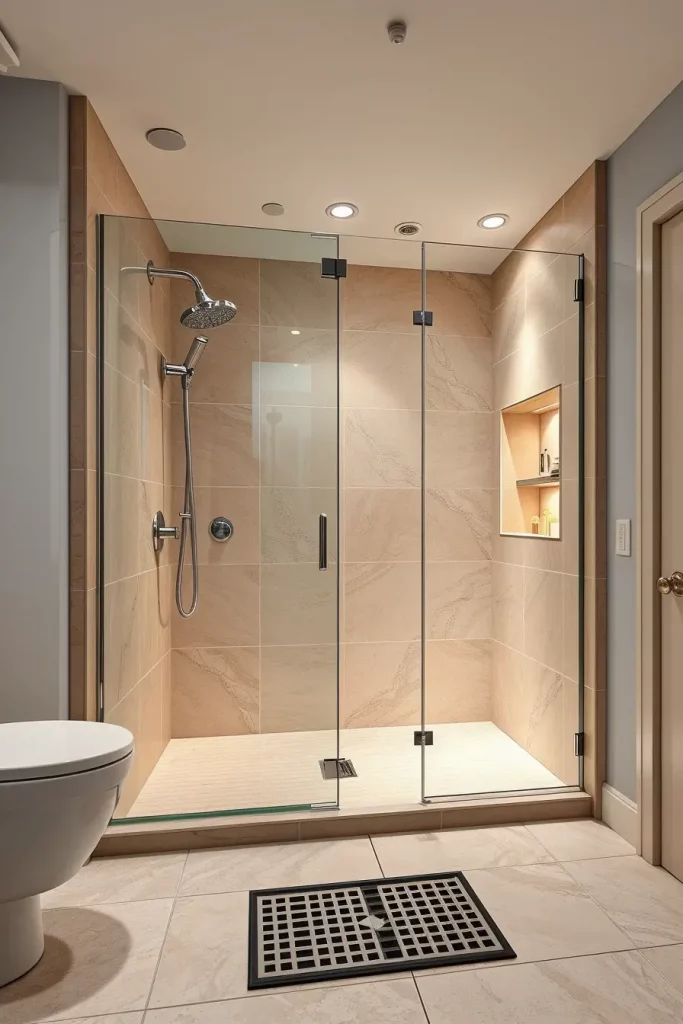 In constructing a walk in shower that will work efficiently in a basement, slip resistant tiles, linear drains, frameless glass panels, and waterproof wall panels are used. A built in shower niche serves to preserve storage and does not interfere with neat lines of the design. I will also select ceiling-mounted rainfall heads or smooth held systems based on the ceiling height and plumbing conditions. The LED lights that are warmed in the shower walls increase the spa feel.