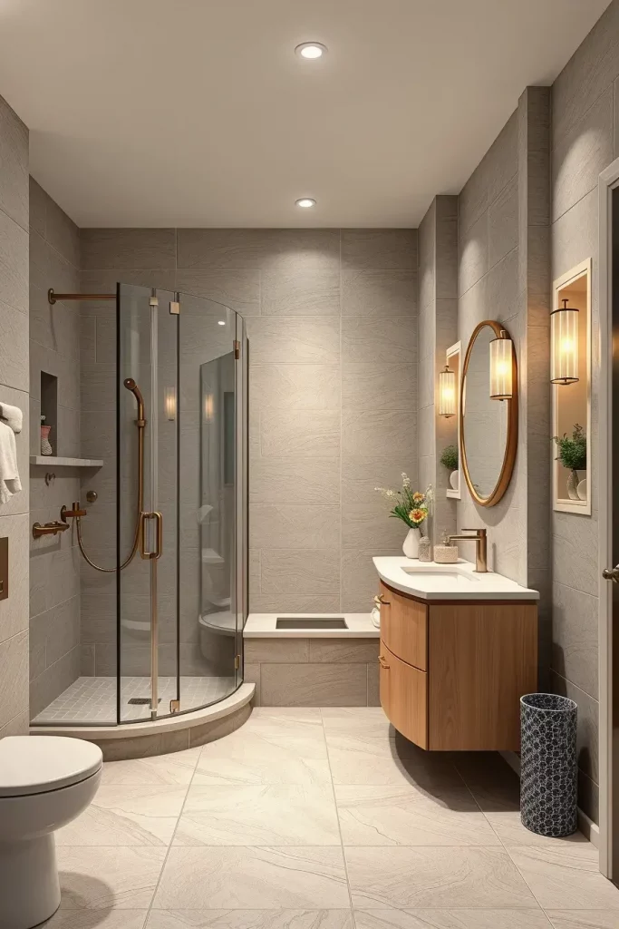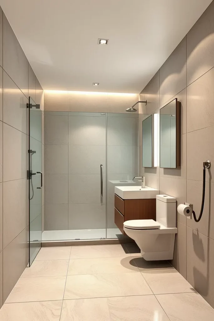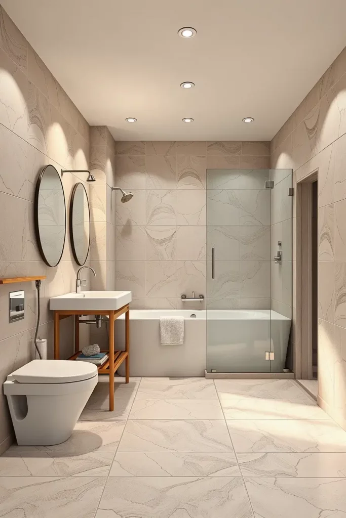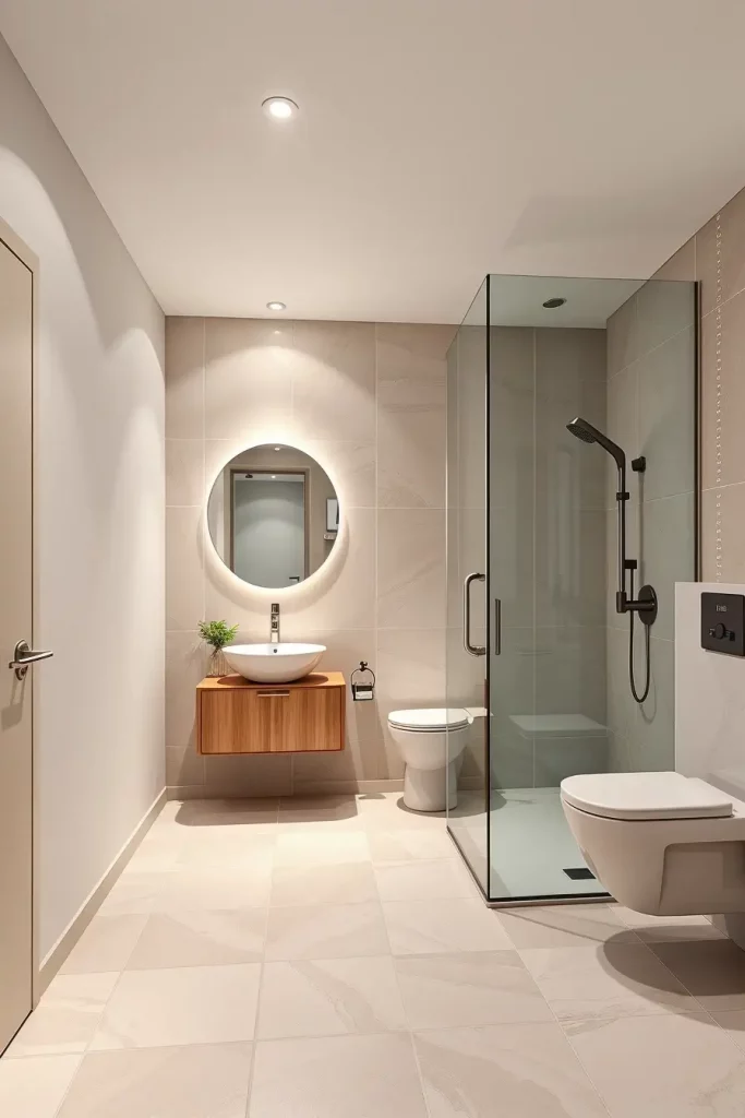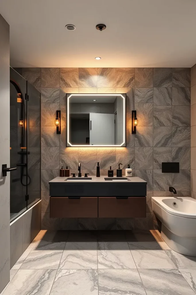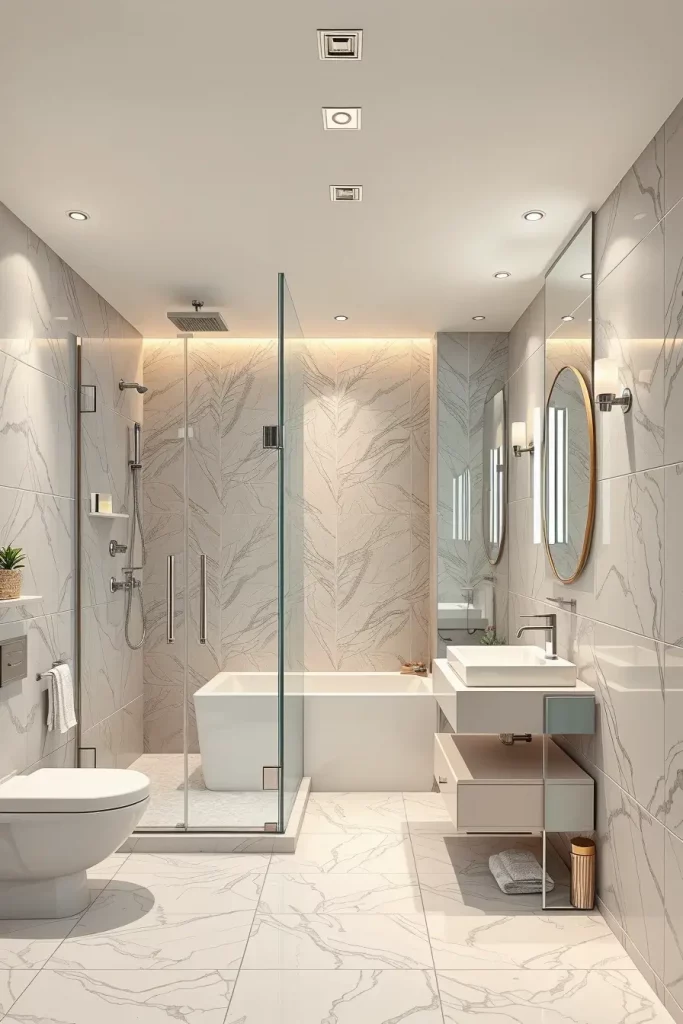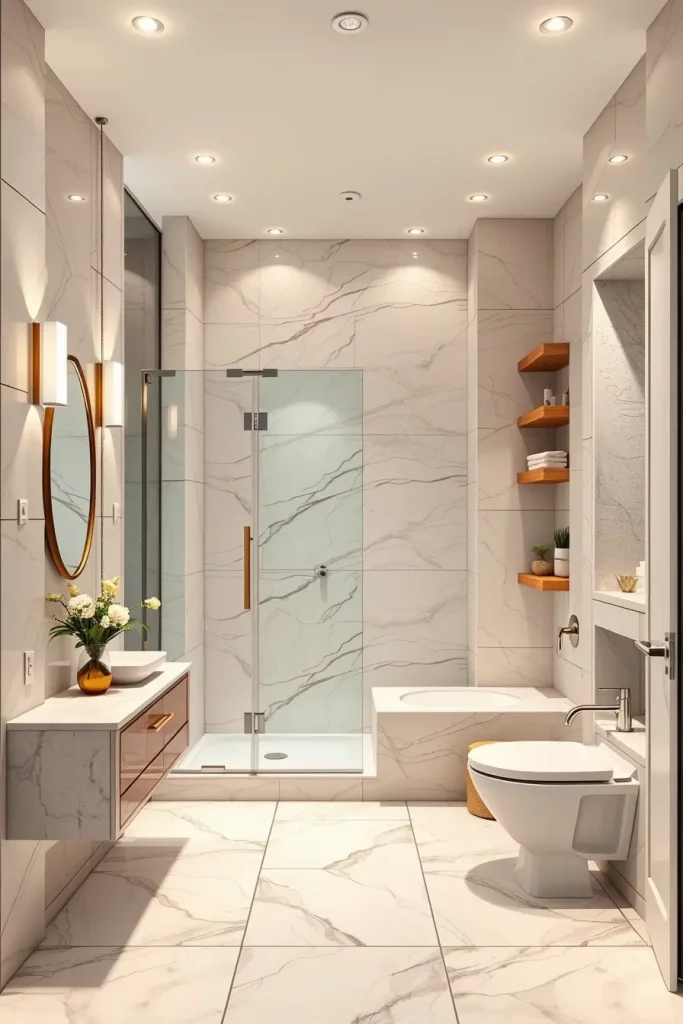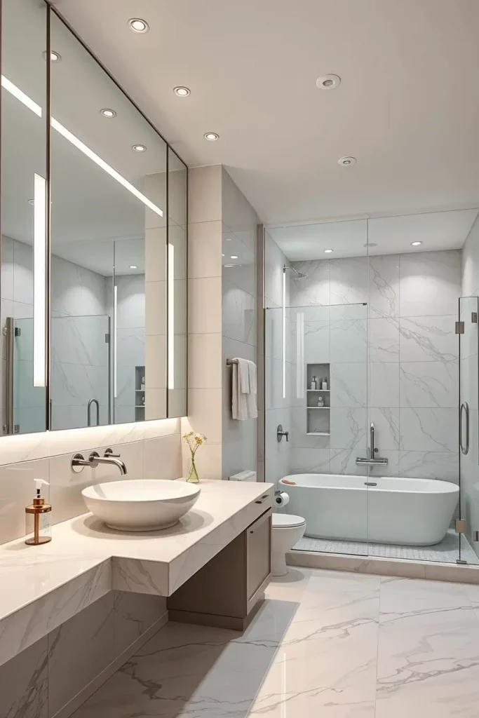 In choosing the elements that I use in this kind of bathroom, I depend on floating vanities, frameless shower enclosures, and concealed storage niches to ensure that the appearance of this bathroom is not cluttered. I also like built-in lighting mirrors and simple hardware as they take the entire aesthetic to the next level. These selections contribute to underlining simplicity and functionality two staples of modern design and still provide a luxurious look. The materials should be strong and not easily affected by moisture and thus porcelain, engineered stone and waterproof laminated panels are the best choices.