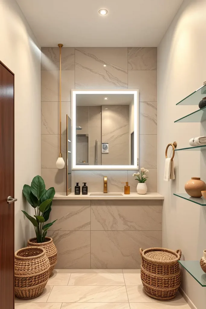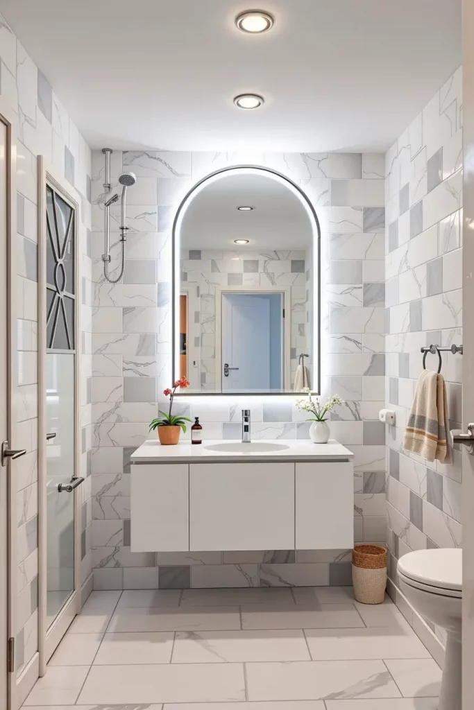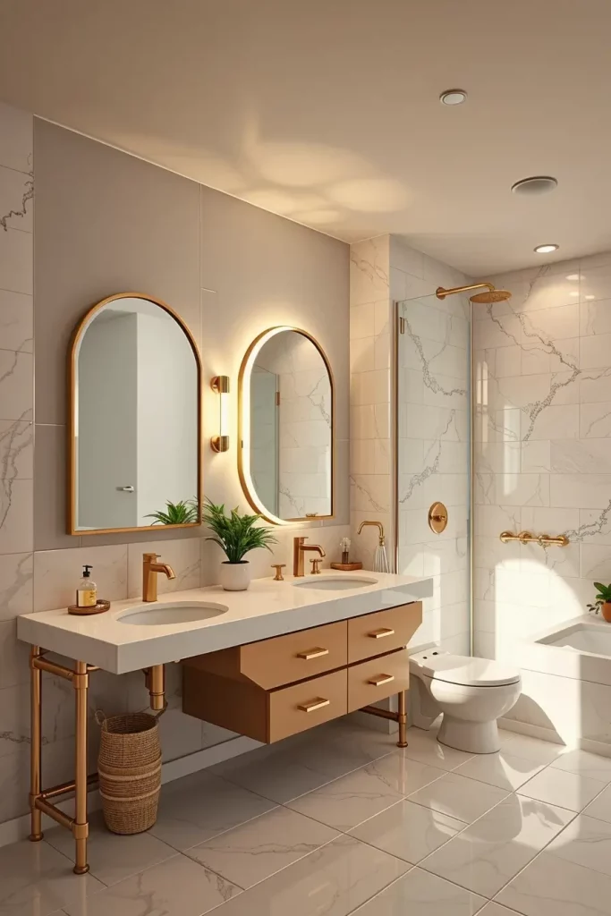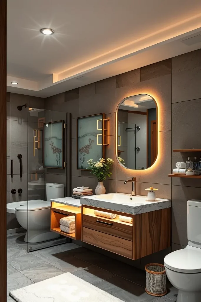 About certain lighting elements, I tend to employ brightly lit mirrors, dimmable light switches, and adjustable color-temperature lights in order to change the mood into a functional one into a calming one. The installation of LED strips in the recessed niches or behind the floating shelves will be visually more interesting, and the look of these items will remain contemporary. I equally like warm-neutral lighting because it gives a natural tone that is quite comfortable and welcoming.