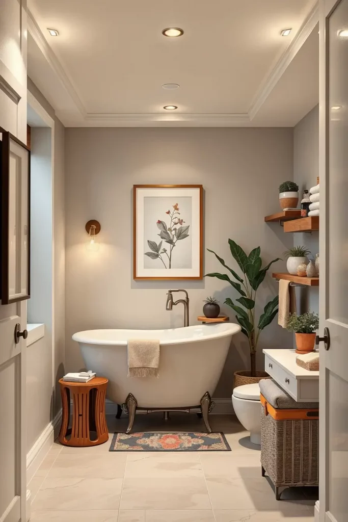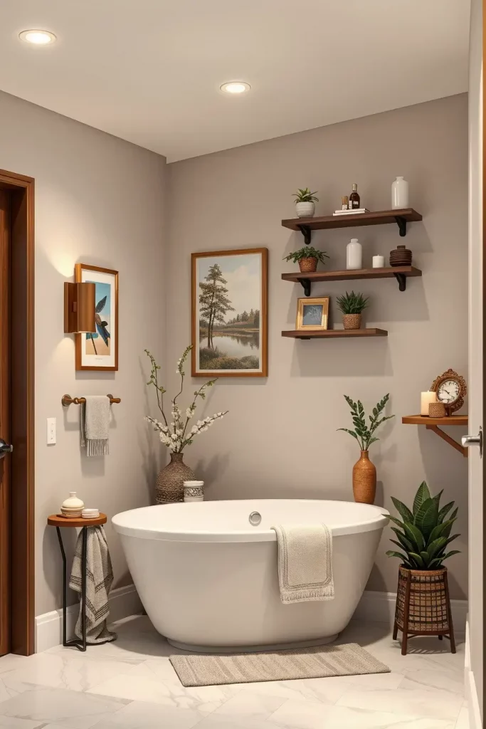In selecting accessories and details, I prefer moisture-resistant fabrics, ceramic stools, woven environmental baskets, powder-coated towel hooks, frameless glass shelves, and soft (neutral) textiles. The introduction of a plant that can withstand low light conditions or a framed picture with a waterproof cover will allow making the room look inhabited without any threat of destruction. These are the components enhancing the primary design characteristics and are pro-longed sustainability.