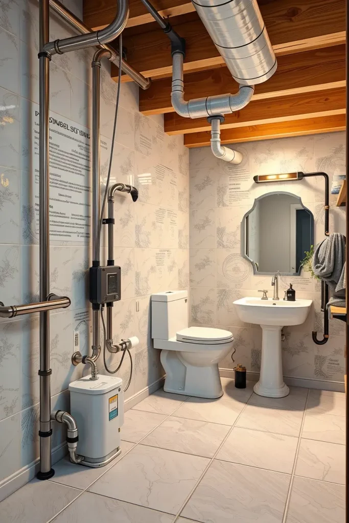 All the components of plumbing are strategic. Upflush toilets have the advantage of transporting the wastewater upwards efficiently and the macerators of solids to avoid clogging. Better drain pump and grey water systems are used to control sinks and showers with ease. I would also use PEX piping because it is flexible and would last longer and insulate it to avoid condensation as it is moisture-resistant.