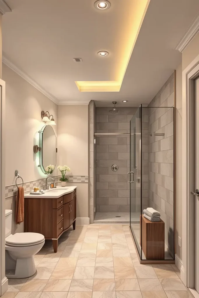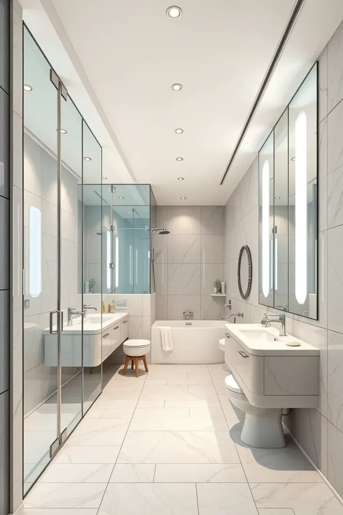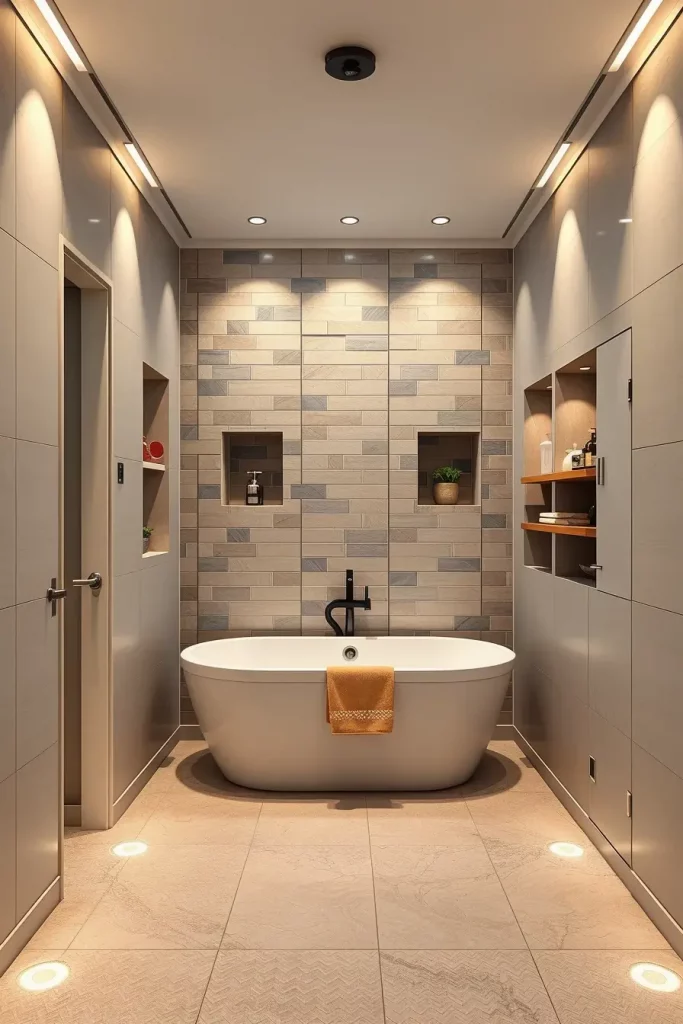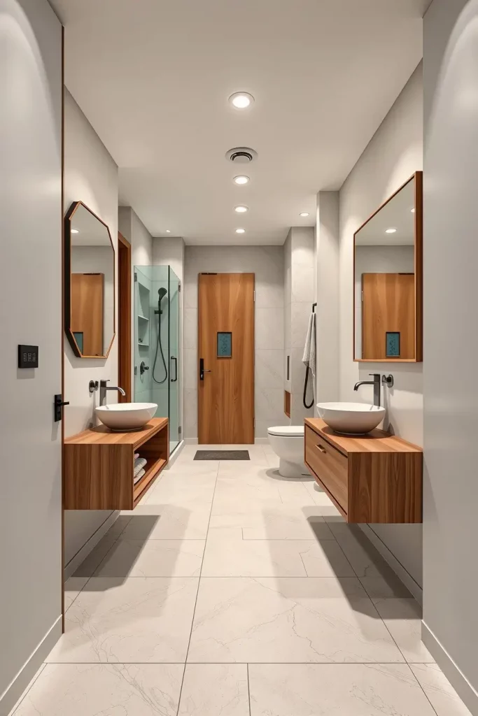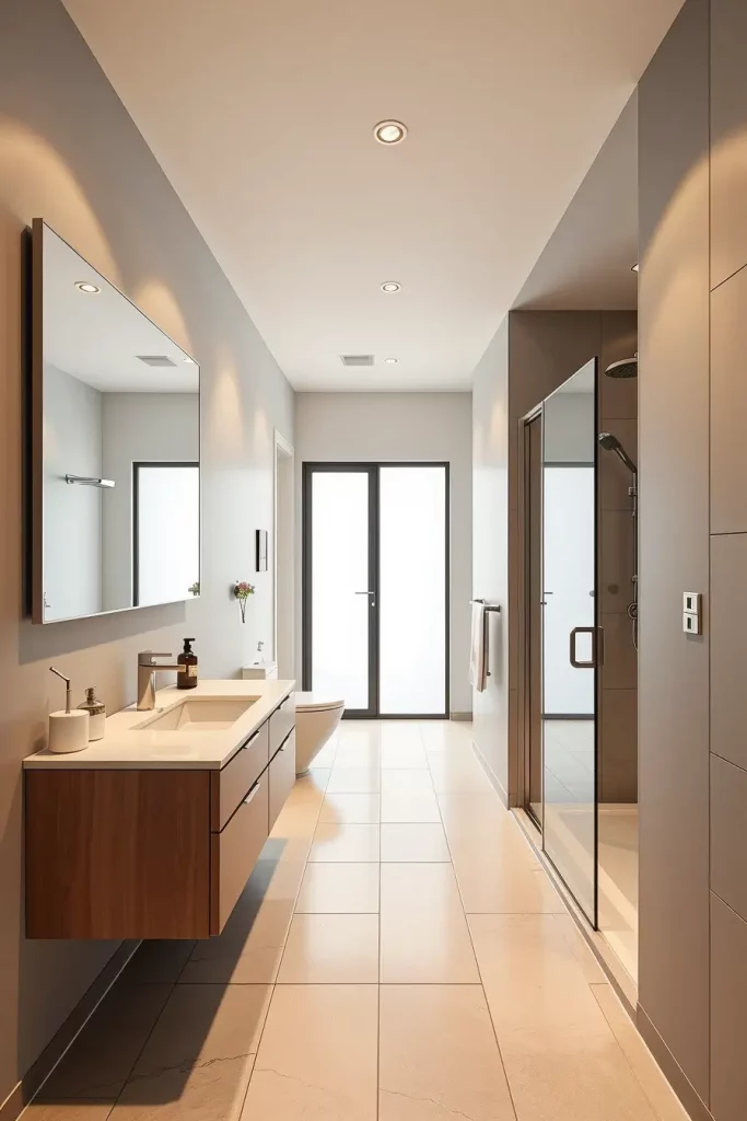 The selection of the appropriate furnishings is also crucial. The floating vanities, slim-profile sinks, compact toilets, and sliding glass shower doors are generally the ones that I would recommend in order to save space. The size of wall mirrors is used to create the appearance of the elongation of the room whereas long floor tiles which are laid against the direction of the length of the room only add to the feeling of the space further. The interior of the corridor is lighted by LED under-cabinet lighting and recessed ceiling lights that do not overpower it.