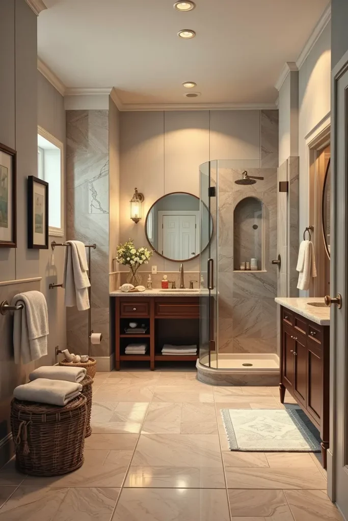 Such factors like comfortable vanity height, sufficient space at the countertop and convenient fixtures are important. I will always make sure that I incorporate hooks to be convenient, open shelving for spares in towels, and a well-fitting mirror to increase the utility. Even more hospitality is offered by use of scent diffusers, soft carpets, and easily accessible storage. The room is larger and more inviting because of a walk-in shower with a transparent glass wall.