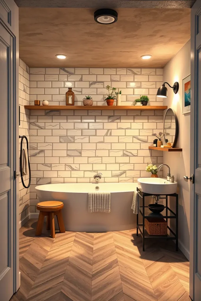 My designs have oversized porcelain tiles, geometric accent strips, textured shower walls, and horizontal tile layouts to increase the feeling of width. To add a decorative touch on the room, I occasionally add a mosaic border or patterned flooring so that I do not overdo it. I would choose tiles that have the advantage of being moisture resistant, durable and easy to maintain, so that they can absorb the moisture in the basement.