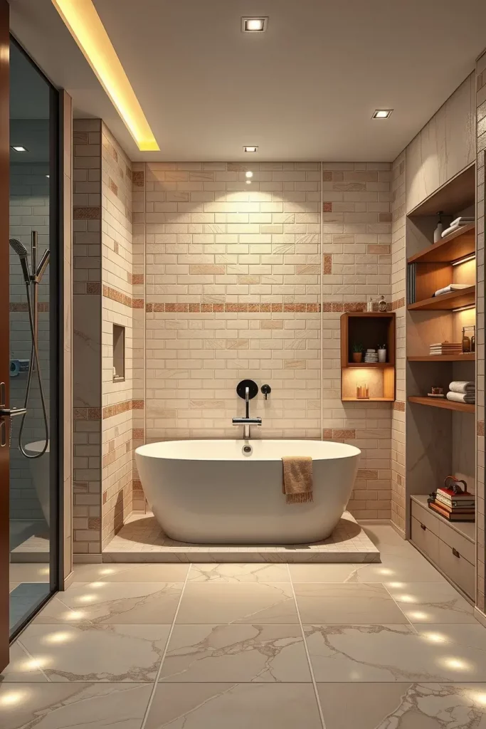 When choosing fixtures in a compact tub layout, I will be very keen on the practicality and the visual harmony. Alcove tubs built in are complemented by tiled walls perfectly and form a smooth surface without moisture problems. The freestanding mini-soaking tub can be effectively used together with wall-mounted faucets, thin storage shelves, and LED perimeter lighting to illuminate an inherently dark space. Every detail is selected carefully: waterproof luxury vinyl floor or porcelain as a durable material, tempered glass screens that allow keeping the space open, and recessed niches that allow keeping the bath must-haves without any messiness.