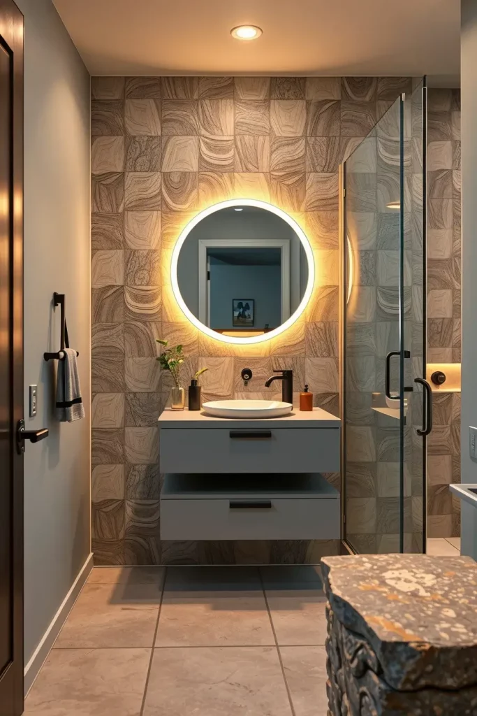 Personally, I have discovered that statement walls can create the most desirable effect on a basement bathroom atmosphere, as they help to distract the view of low ceilings or unavailability of windows. It is the consensus of many professionals that a focal point can be used to visually enlarge narrow or dark rooms. The sole detail that I could add is a matching accent in the lighting, i.e., a warm LED strip or a sculptural sconce to create a deeper impression and emphasize the texture of the statement wall.