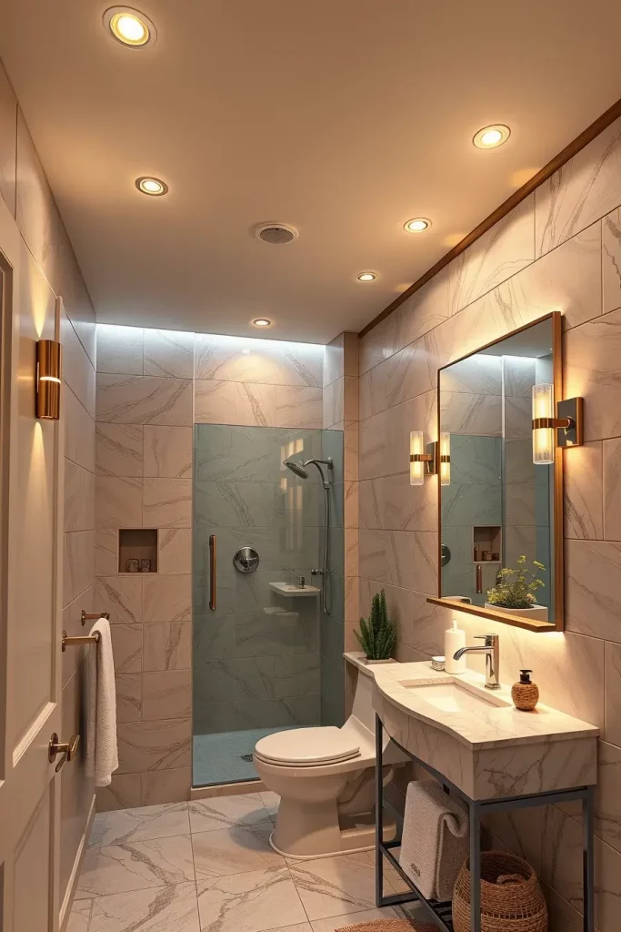 I would also install under-vanity lighting or illuminated shower niches to make the dark parts of the area bright to get maximum performance.