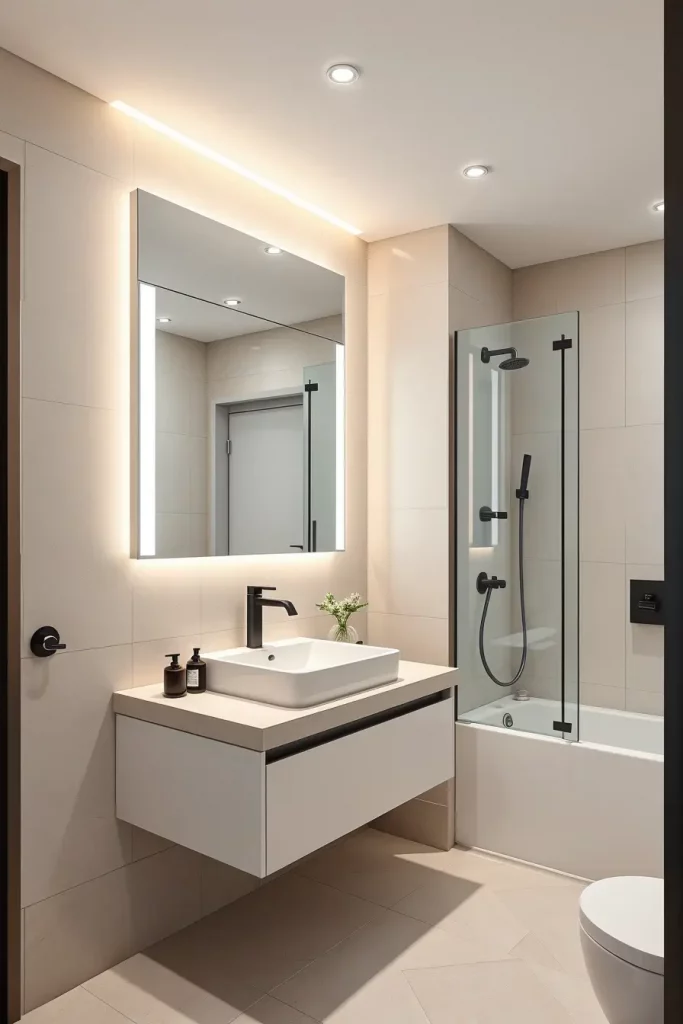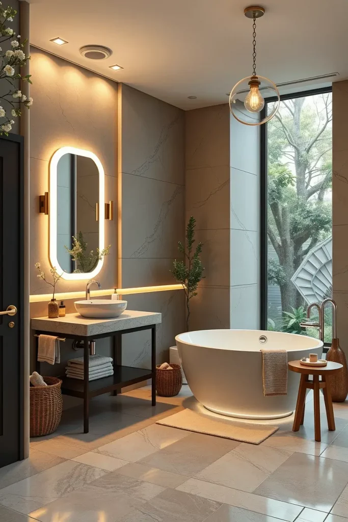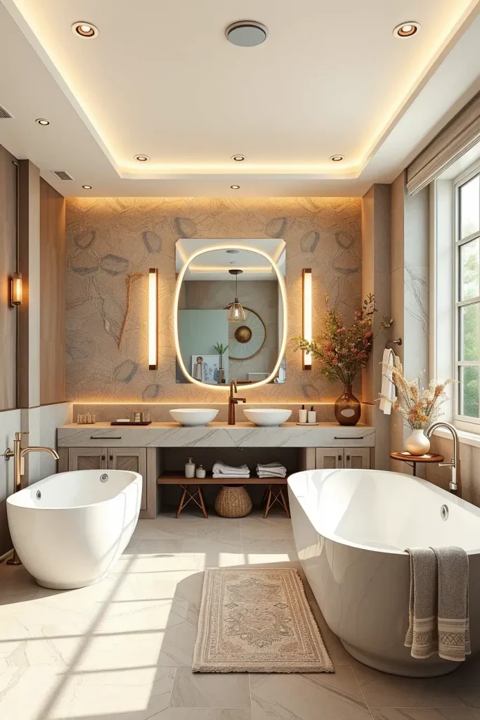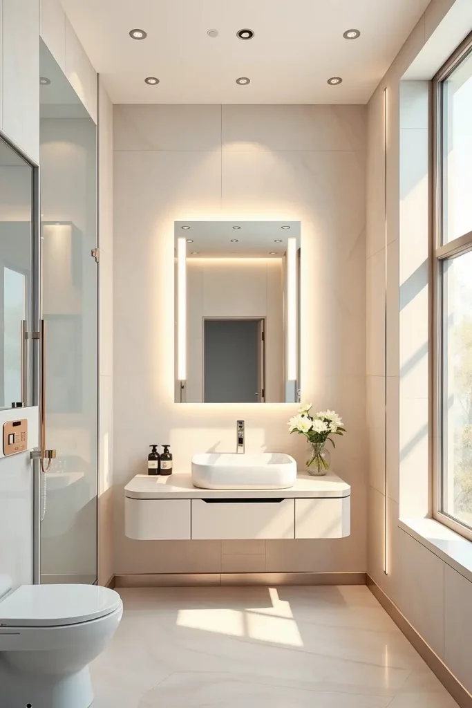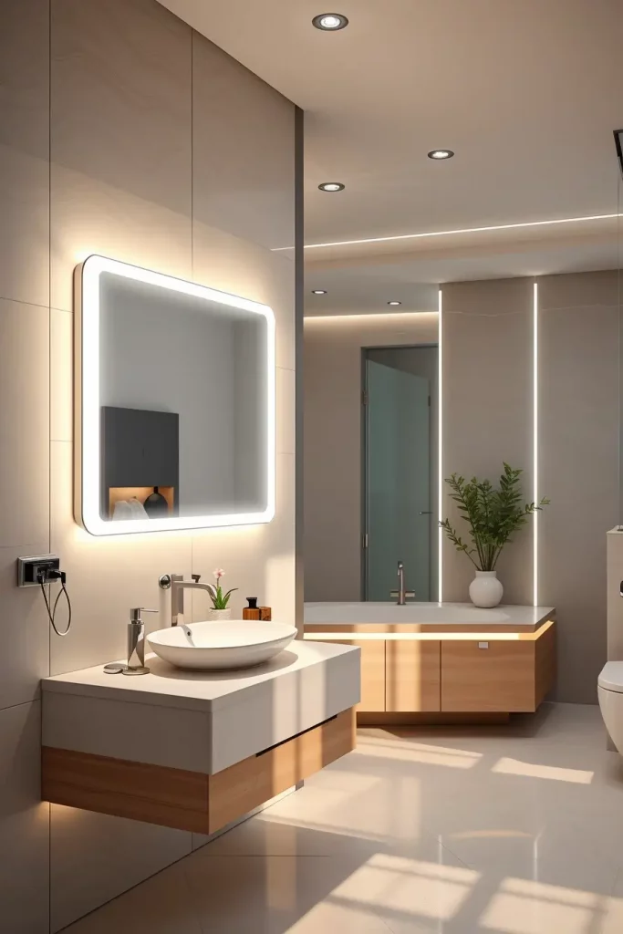 In order to make the design more high-end, I prefer combining dimmable mirrors with freestanding tubs, natural-textured wall tiles, and soft LED accent-lights in the entire room. The customizable temperature controls – warm or cool light – are used to create the overall mood. The combination of serene palettes and tranquil color palettes makes the effect luxurious and healing.