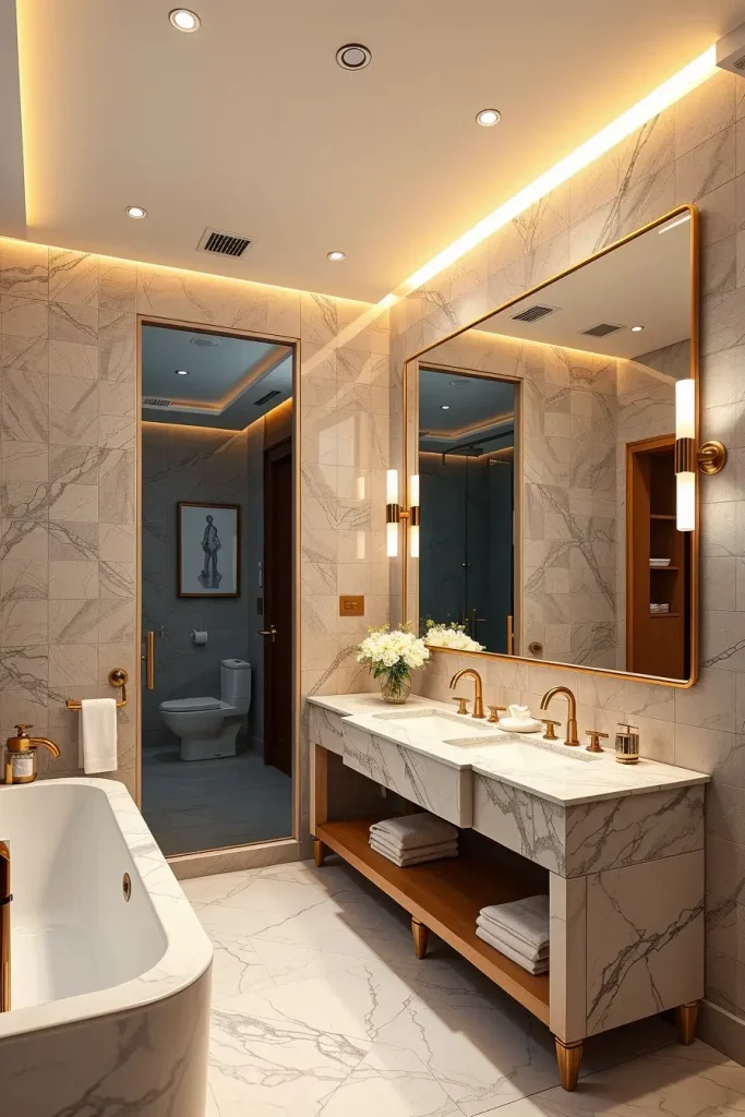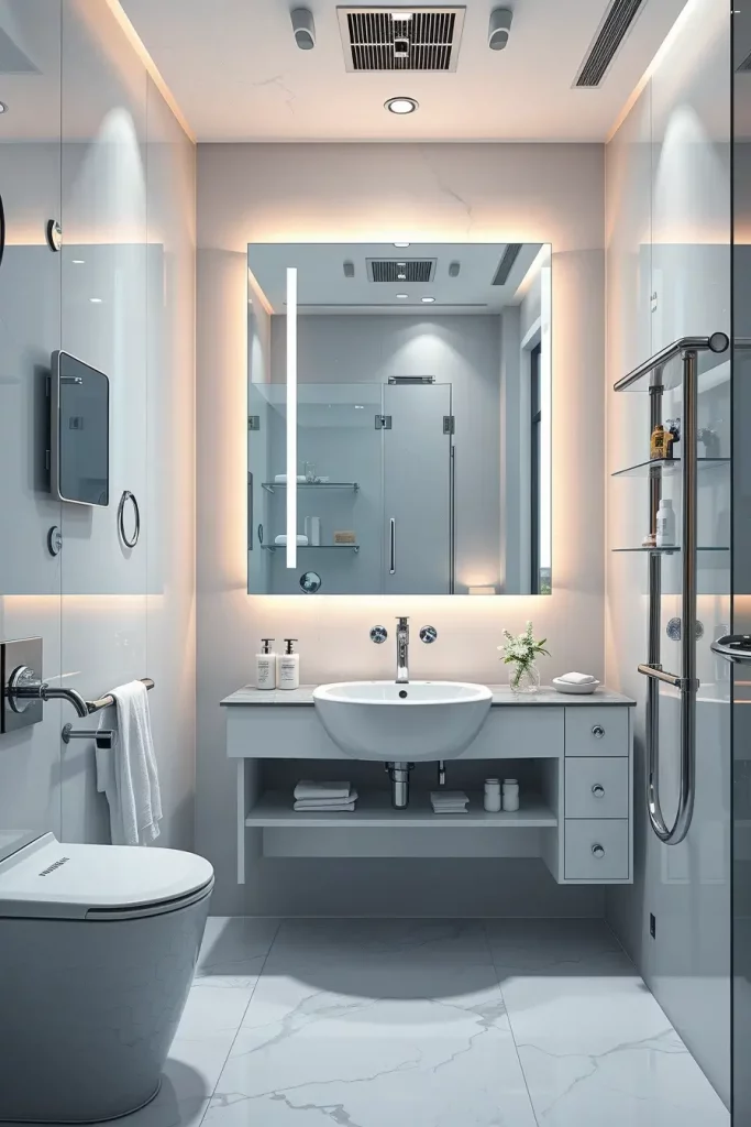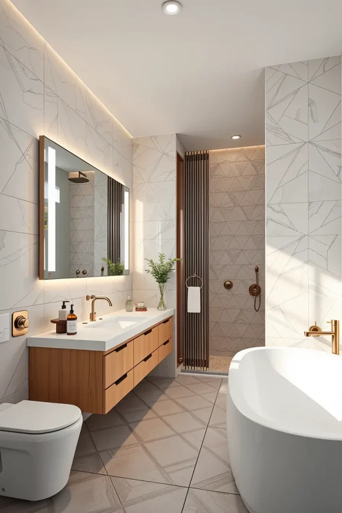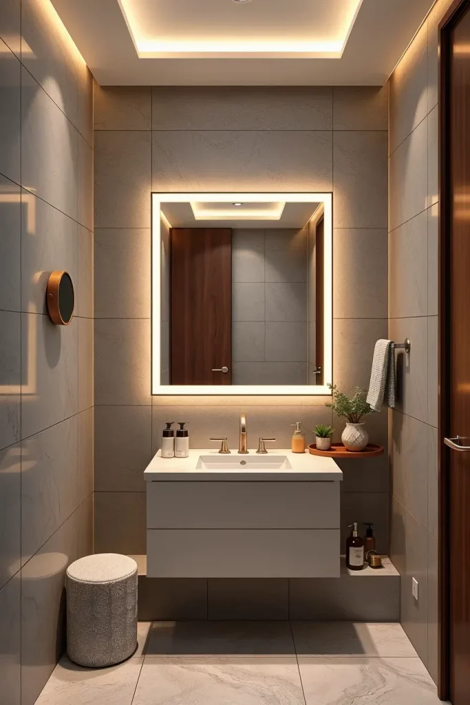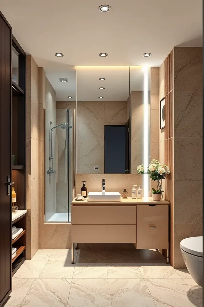 In order to make the design more high-end, I prefer combining dimmable mirrors with freestanding tubs, natural-textured wall tiles, and soft LED accent-lights in the entire room. The customizable temperature controls – warm or cool light – are used to create the overall mood. The combination of serene palettes and tranquil color palettes makes the effect luxurious and healing.