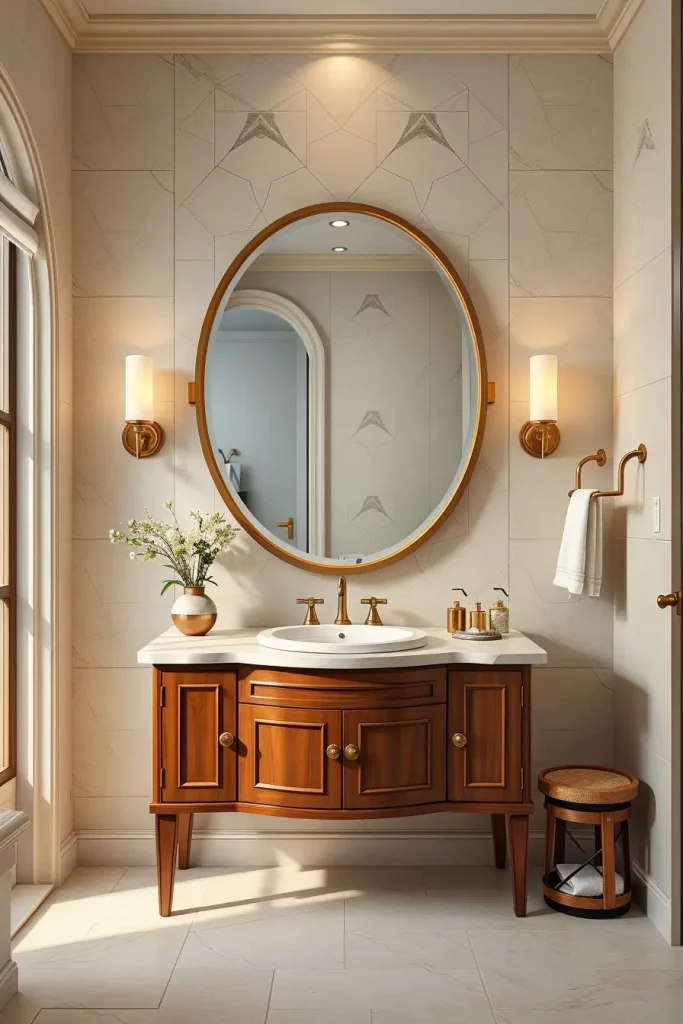 On my design works, I tend to install the oval mirrors over the vanity with warm wood or creamy stone top surfaces. Such a mix of colors makes the atmosphere balanced, harmonious. The soft form is well matched with wall sconces, brass fixtures and clean-cut tile-patterns. The slightest of details, such as the faucet curves, hardware on the cabinets, all contribute to the soft, unifying quality that oval mirrors introduce into the interior.