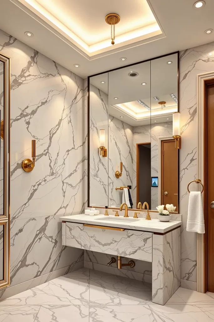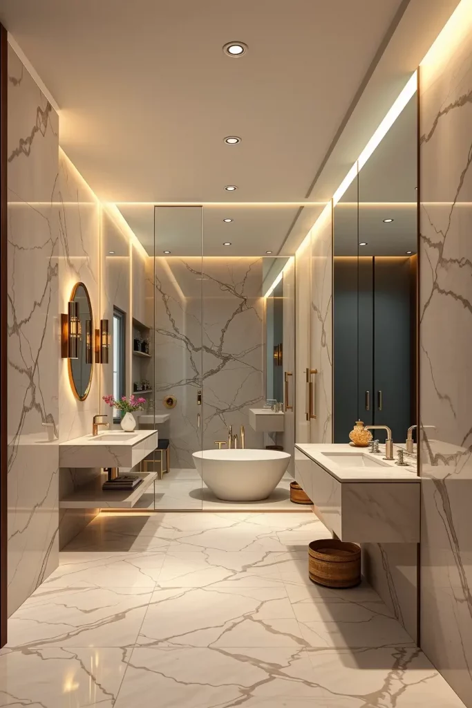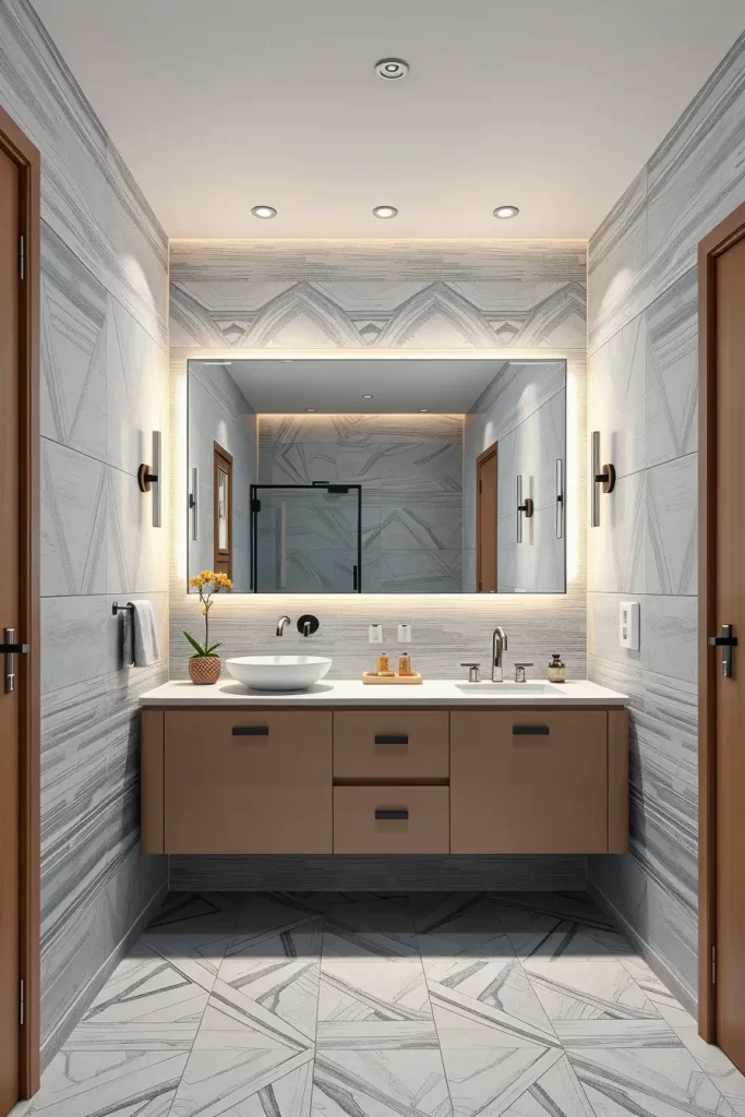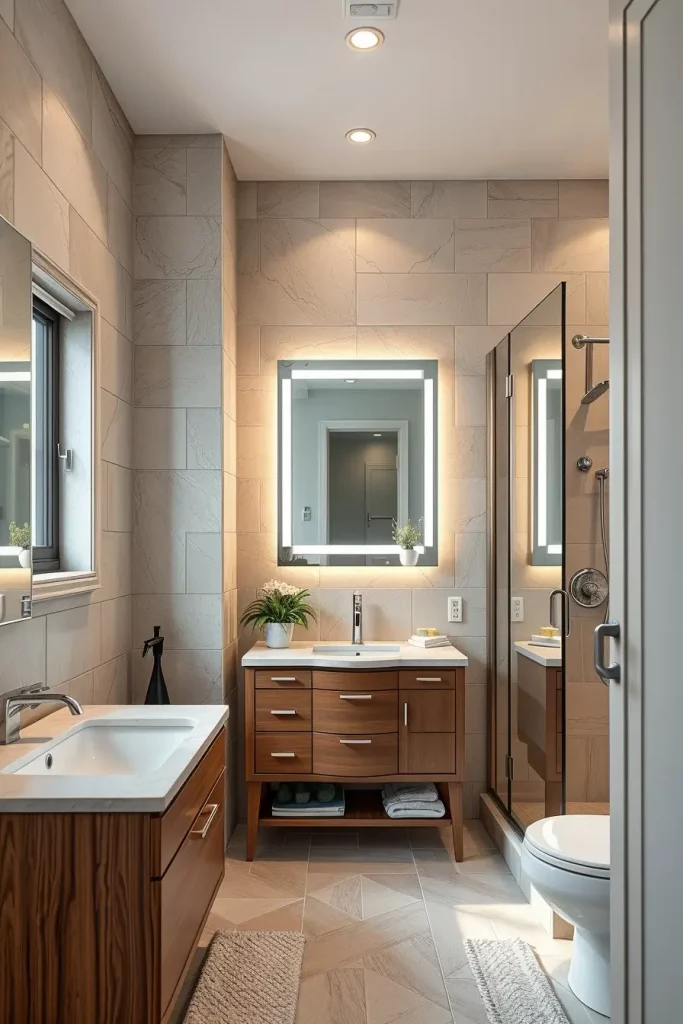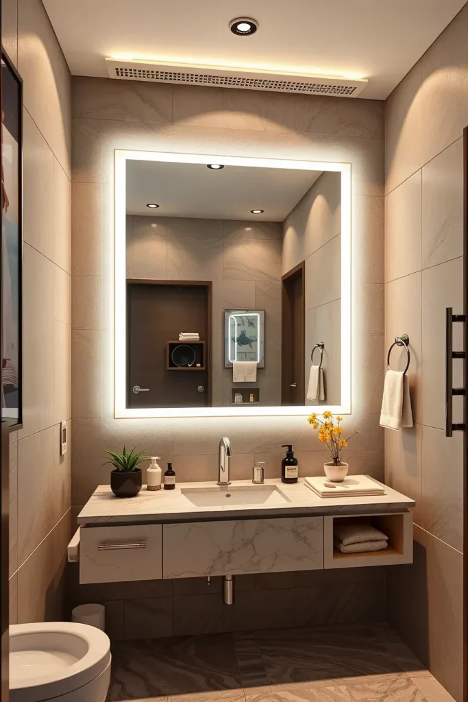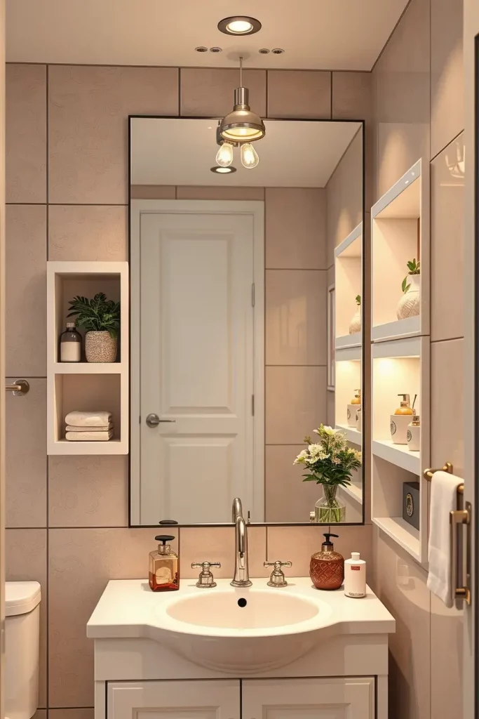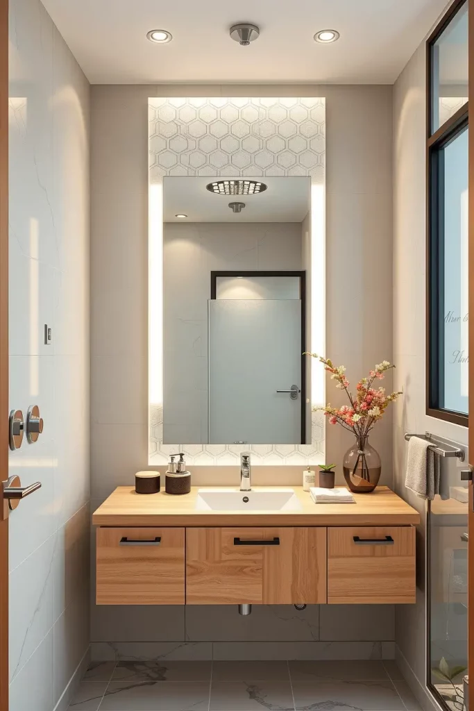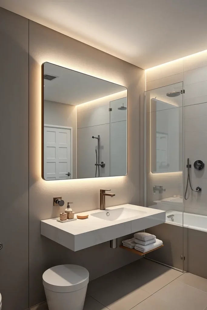 I tend to put a sleek vanity, few faucets, and light neutral tilework next to a full-width mirror to enhance brightness in the mirror. No framing designs are the best as they sustain continuity along the wall, and avoid the visual cluttering. I frequently include inbuilt LED lights over or under the mirror to enhance the feeling of openness.