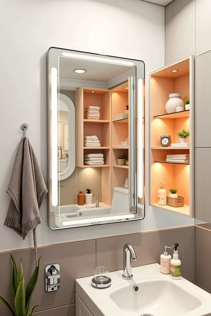 I use storage mirrors in my designs that have slender vanities or a small amount of wall space. The shelving also can either be recessed or floating, which depends on the architectural building. I tend to combine these mirrors with contemporary furniture, small light sources, and more basic things like skincare or haircare. The shelves are inbuilt to ensure that the room is well organized without compromising on the cleanliness.