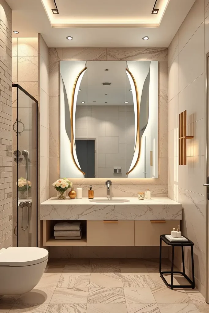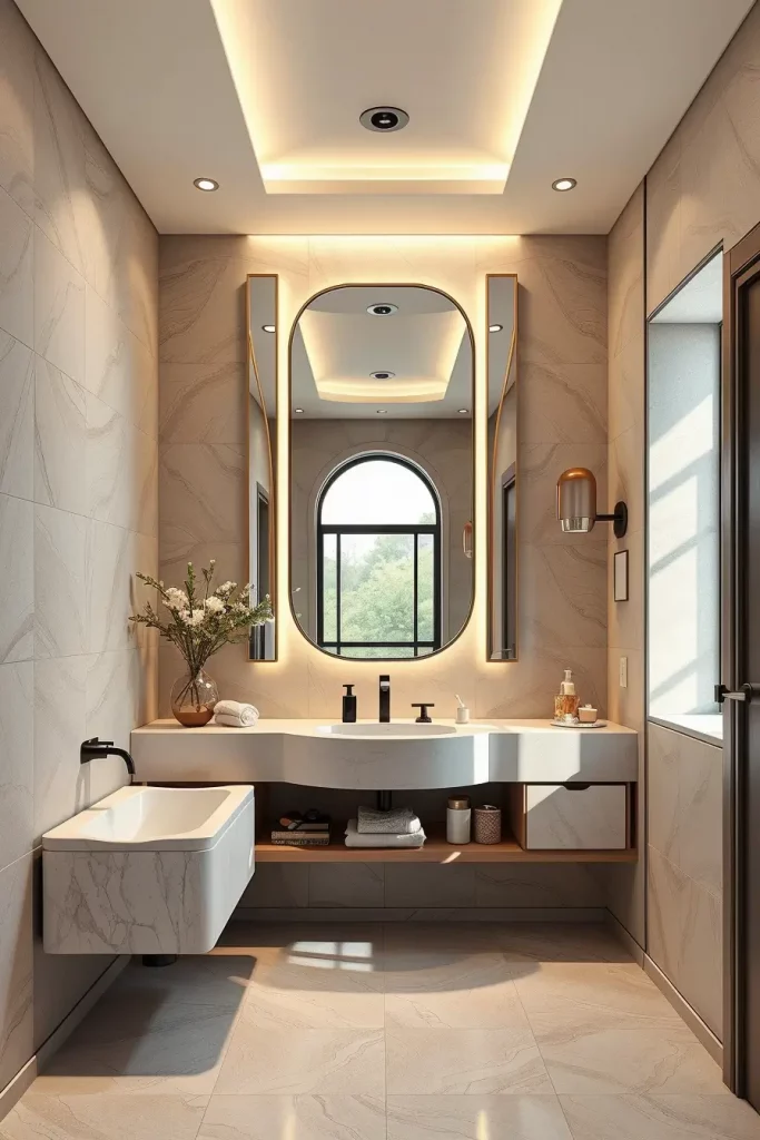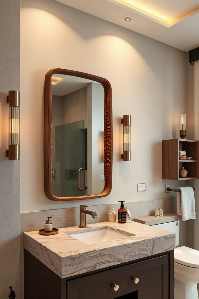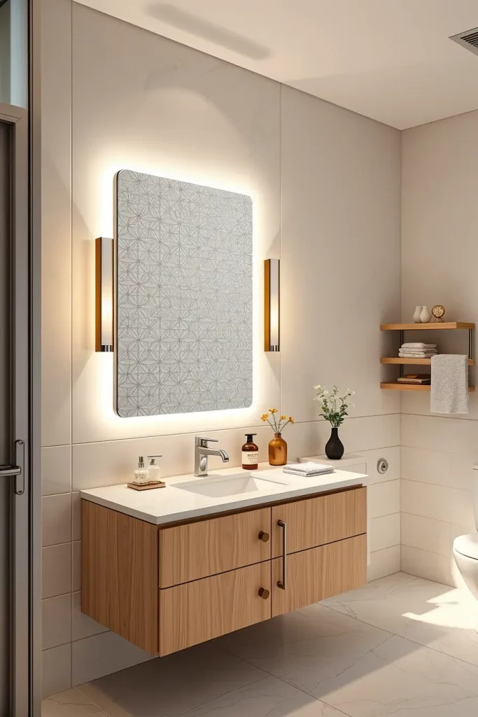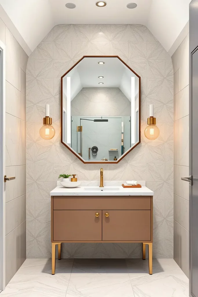 Such mirrors have been most effective in combination with simple, uncomplicated aspects on design like flat-panel vanities, smooth tilework, and subtle metallic finishes. Since geometric mirrors are already a visual focus, I opt to have neutral backgrounds or rather lightly textured backgrounds to aid in balancing the boldness of the figure. These shapes are often beautifully enhanced by wall sconces or tall slim bars of lighting.