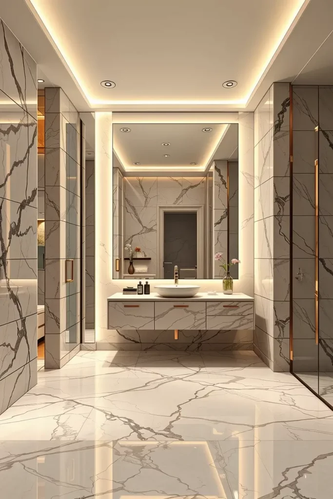 Backlit mirror walls also provide a dramatic impression of the luxurious style, which makes even a basic bathroom look like a luxurious spa. In case I desire to make an immersive visual impression, I will have full-height mirrors installed with LED lights surrounding the edge. The outcome is expansive, shiny and definitely luxurious.