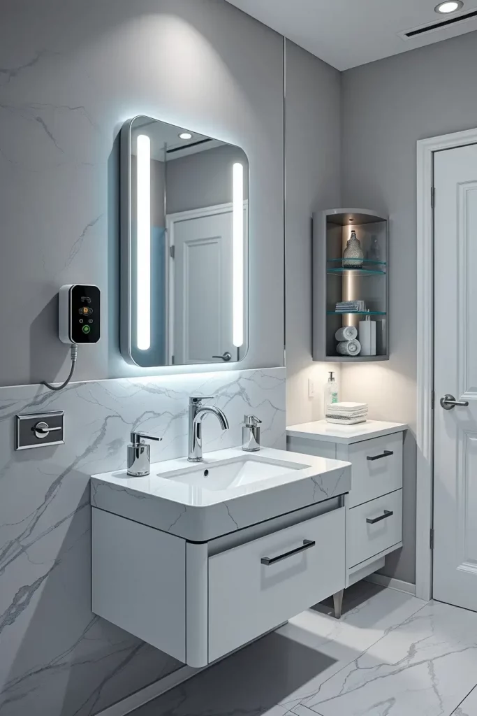 The introduction of smart mirrors with a motion-sensor light is becoming a necessity that the modern bathroom cannot afford to be without, particularly in cases where the homeowner seeks to add advanced convenience to his or her daily life. These mirrors are very useful in my design of a technologically-enhanced space as they offer hands-free lighting as soon as one comes into the room. This is particularly beneficial when one is performing operations at night, since he or she does not have to struggle to find switches in the darkness.