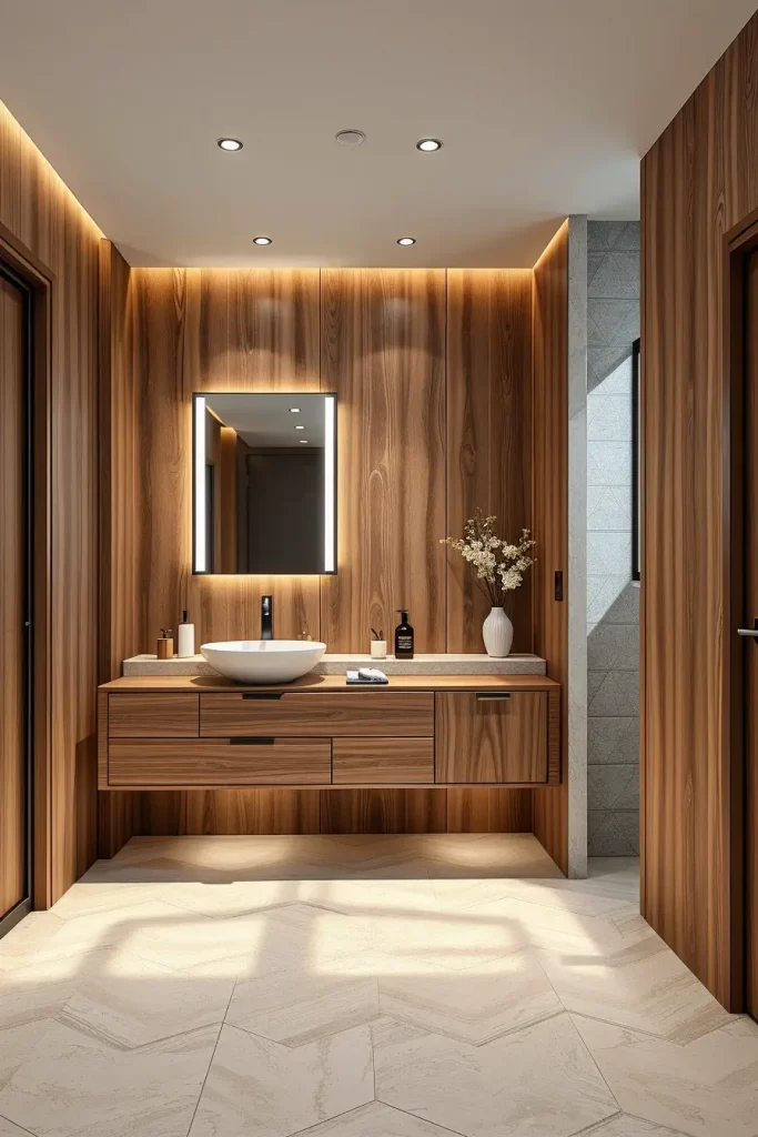 I normally prescribe such types of cabinets as floating wood vansity, tall vertical cabinets, or framed wooden storage towers. The grain pattern plays the central role of design and thus to continue the natural beauty of the piece I prefer the pieces whose bottom has a distinct varnish or matte seal without losing the moisture resistance. Hardware can be used in either brushed brass or matte black which is effective to increase the aesthetic of the whole.