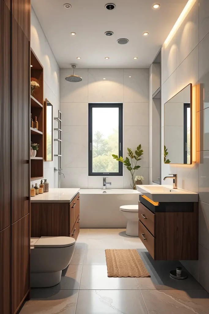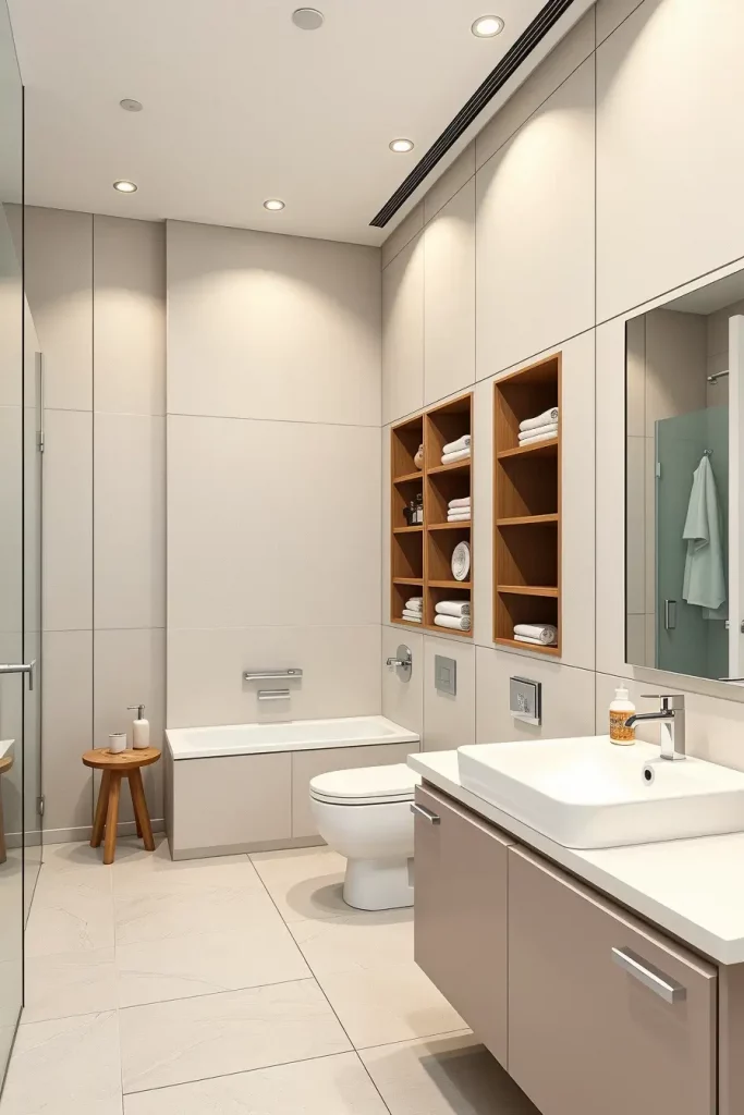 Where it applies to built-ins, the recessed wall cabinets, integrated vanity towers, custom drawers tailored to the available space and wall-to-wall cabinets are what I consider the most advantageous. I prefer to work with the materials that correlate with the architectural features of the bathroom like continuous wooden panels or mat laminate that should correspond to the rest of the surfaces. Depending on the layout, built-ins can be applied to large and small designs.
