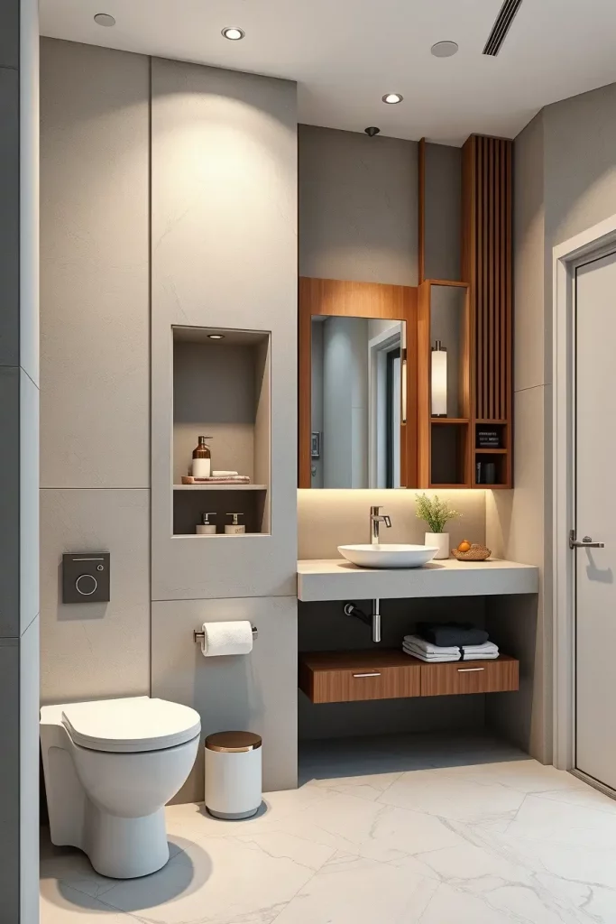 In the case of hidden storage, the elements I tend to use are recessed wall cabinets, mirror-front cabinets, side-opening cabinets, toe-kick drawers under the vanity and wall panels which may conceal storage areas. All elements are built to blend in the architectural lines of the bathroom to make the place appear larger and more coordinated. Another thing I value is soft-close hardware which ensures there is a smooth and noisy user experience.