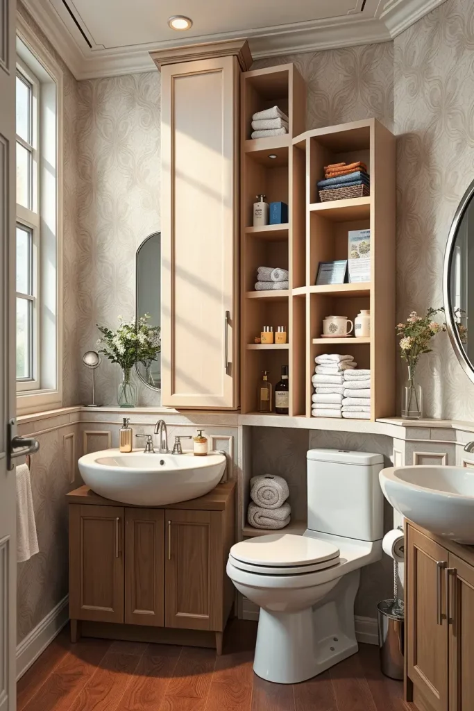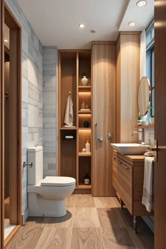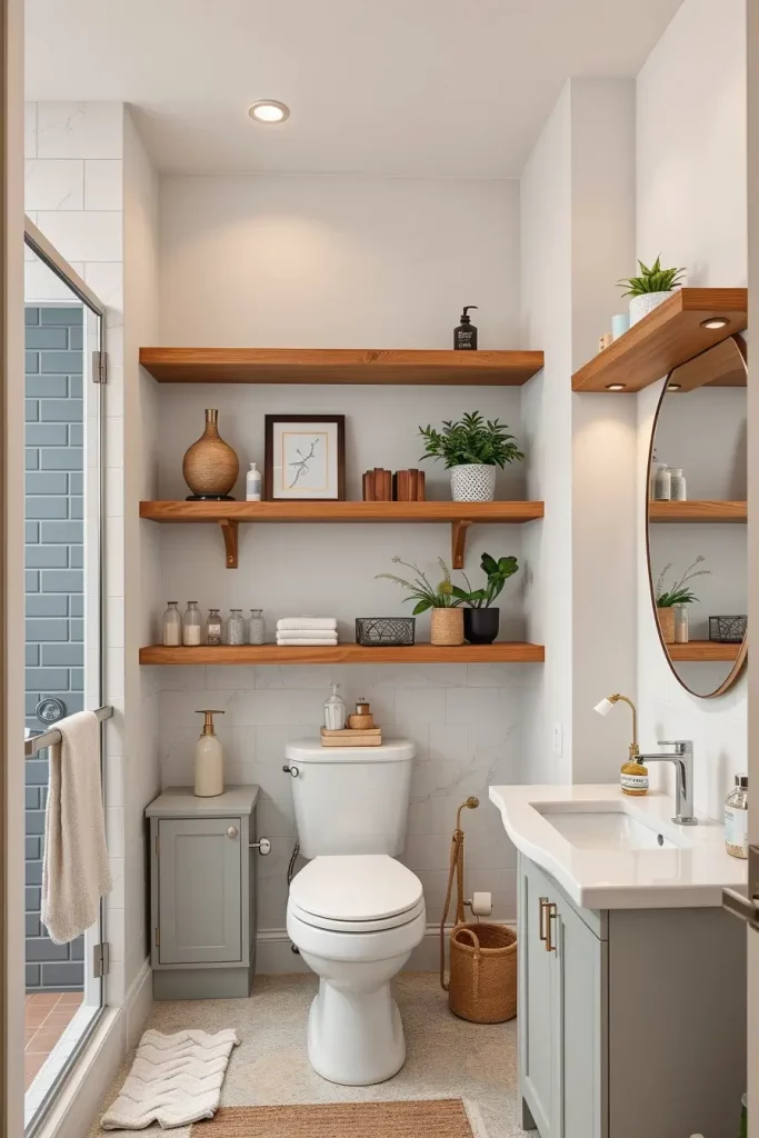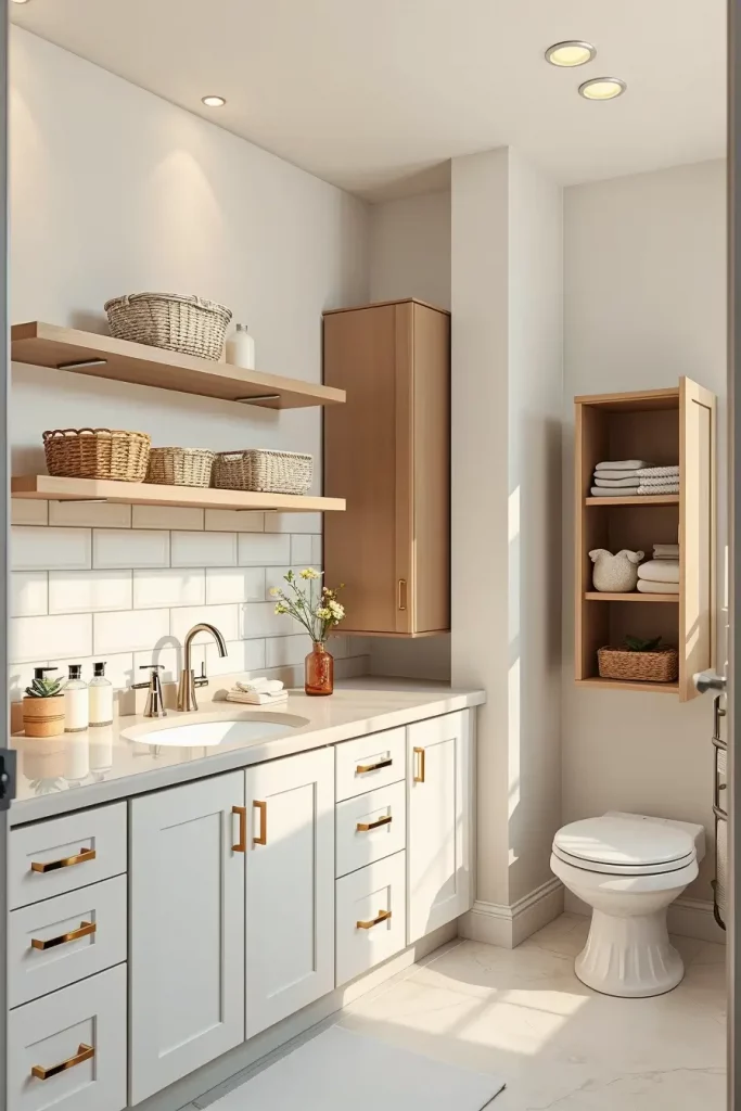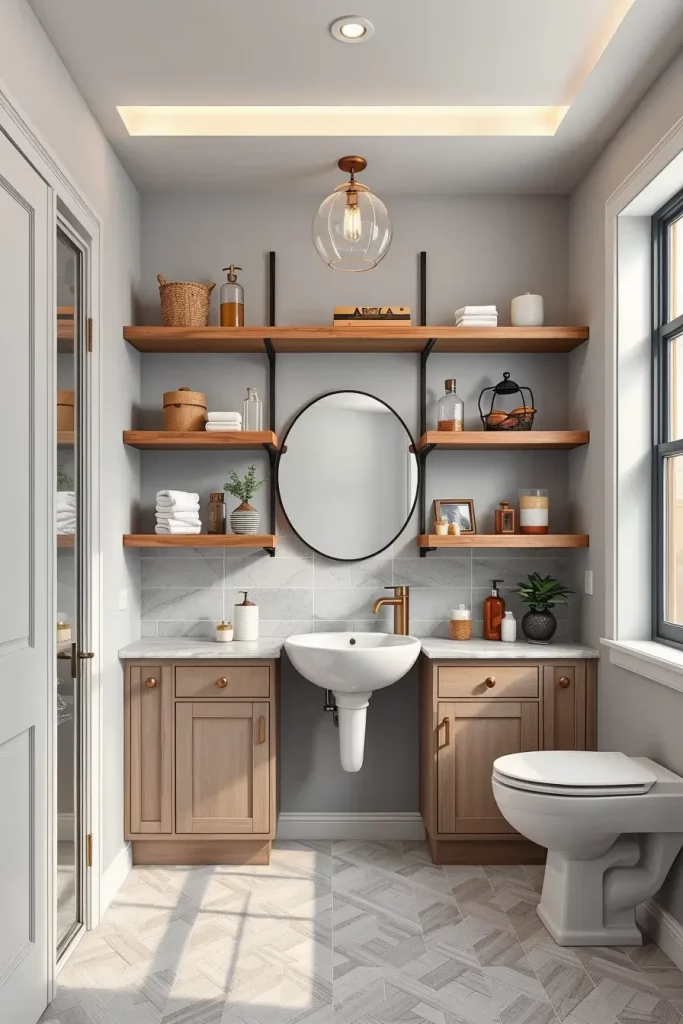 The items that I tend to incorporate include open wooden shelves over the toilet, partially open vanities, tall cabinets with open and closed parts, and floating shelves around the sink. I would like to work with such materials as natural wood, painted MDF, and metal brackets, to make a layered appearance. Day-to-day items should be closed and the open shelves should be used in the storage of items like rolled towels, or decorative jars, or greenery that adds color to the room.