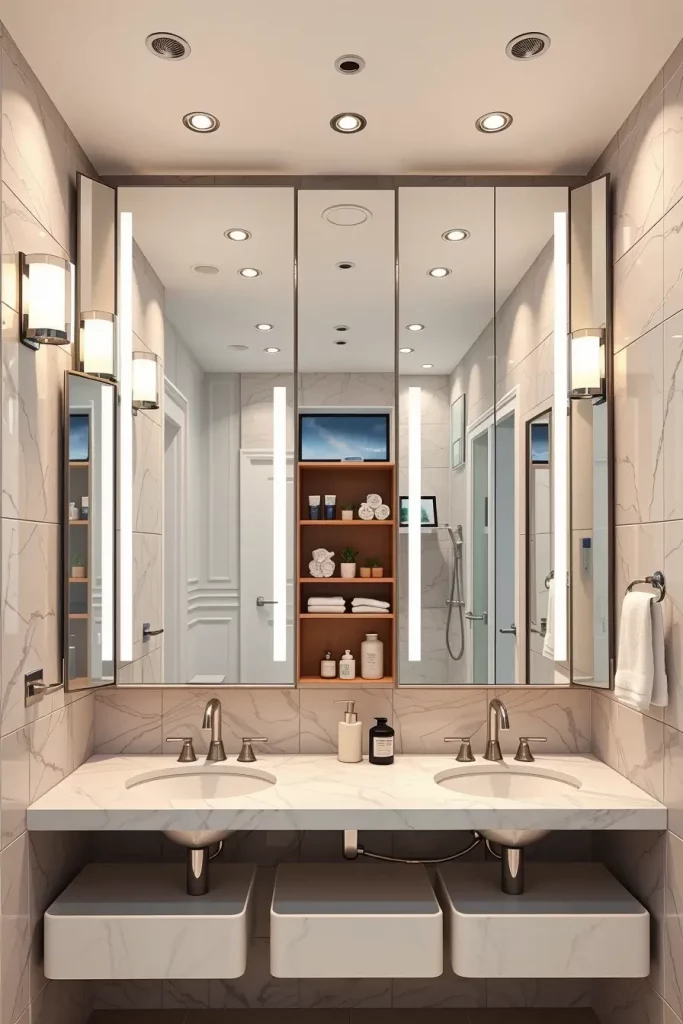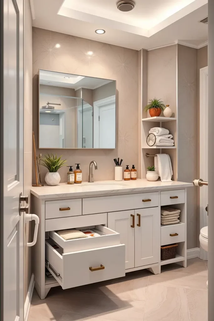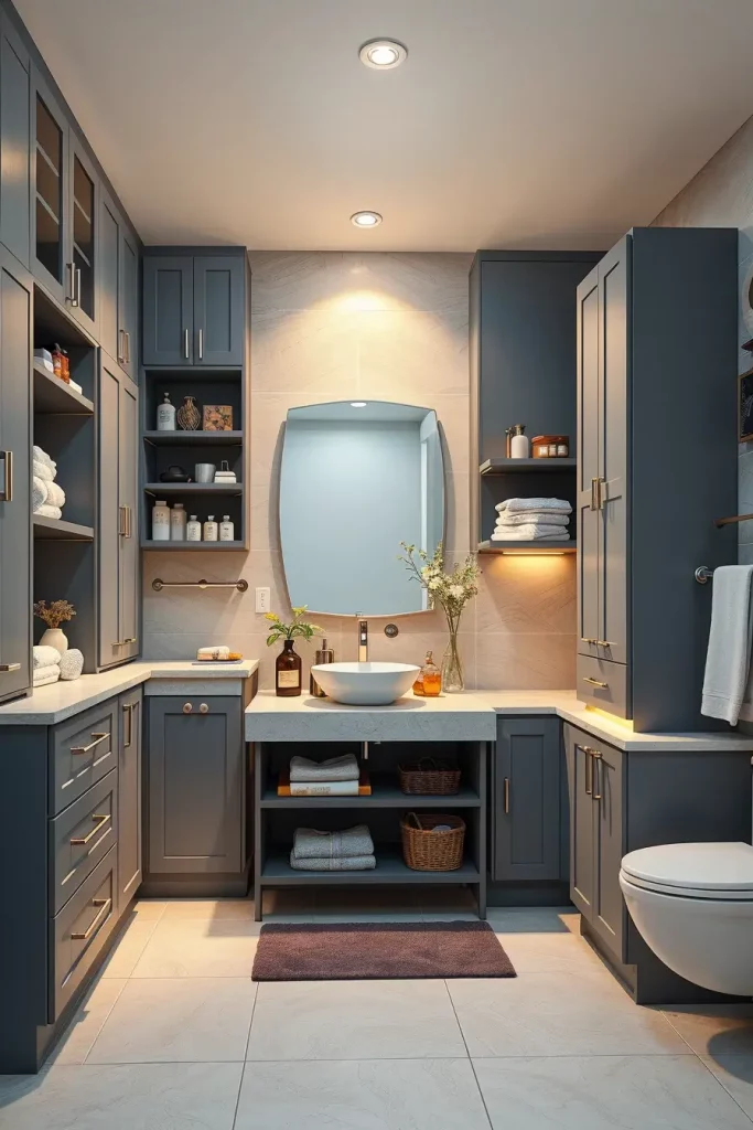 Personally, I prefer using hidden storage which is very useful in terms of preserving the visual order without compromising on the utility. The fact that the storage is hidden is a feature emphasized by many U.S. design experts, particularly in smaller or modern bathrooms, where an open shelf can be too noisy to the eye. Having built-in cabinets has taught me that it is possible to have important objects that are in easy reach and have the counter tops neat at the same time.