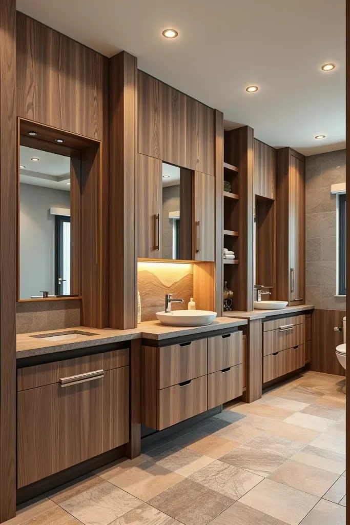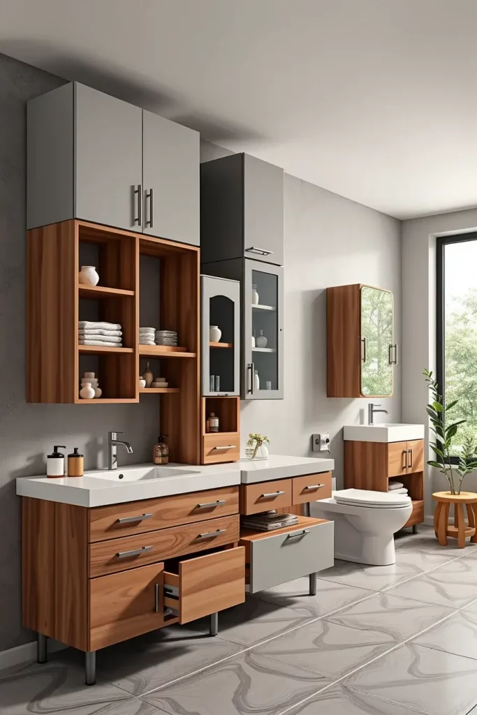 I generally use modular vanities, stacked cabinets, open cube shelving, and units mounted on the walls to give easy and convenient storage as well as concealed storage. The materials include matte lacquer and composite woods, as well as metal structures increasing the durability. I would also like to employ general finishes such as warm wood, crisp white, or deep charcoal so that the system could be aesthetically harmonized although the homeowner may add or rearrange pieces in future. Internal organizers that have modular drawers can also aid in ensuring that the environment is neat and free of clutter.