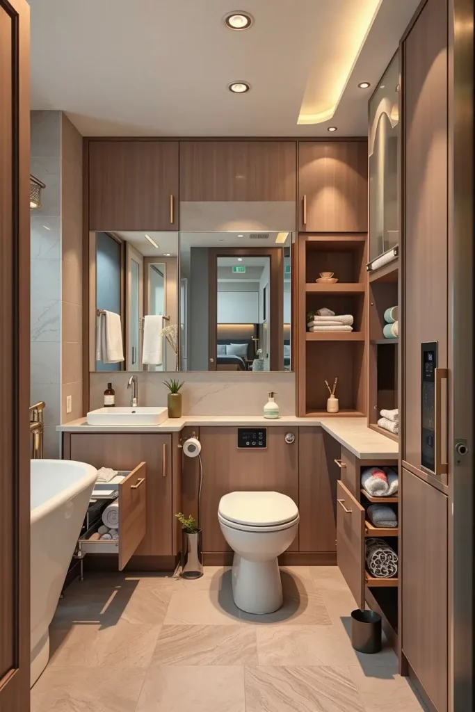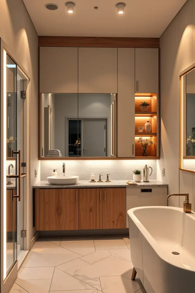One of my favorite tricks, as far as designing the bathrooms that should look clean and streamlined is concerned, is undercover storage cabinets. I have done many jobs with people in their homes that complain that their bathroom looks messy even when they have plenty of storage areas and concealed cabinetry is the answer to this problem. Such designs generally blend with the wall or appear to imitate the other finishes so that they look as though they are one continuous surface. This solution is very appropriate in modern minimalism and functional elegance in 2026 bathrooms.