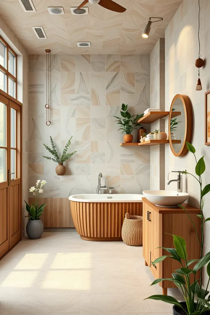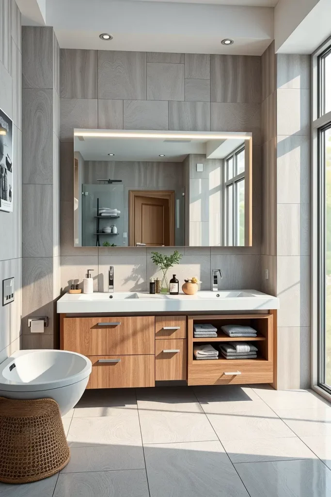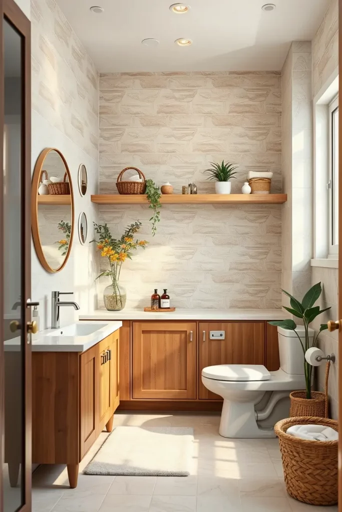 In this part, I would include recommendations of how to organize wood accessories, including trays, toothbrush holders, or small stools to create a consistency of the entire space.